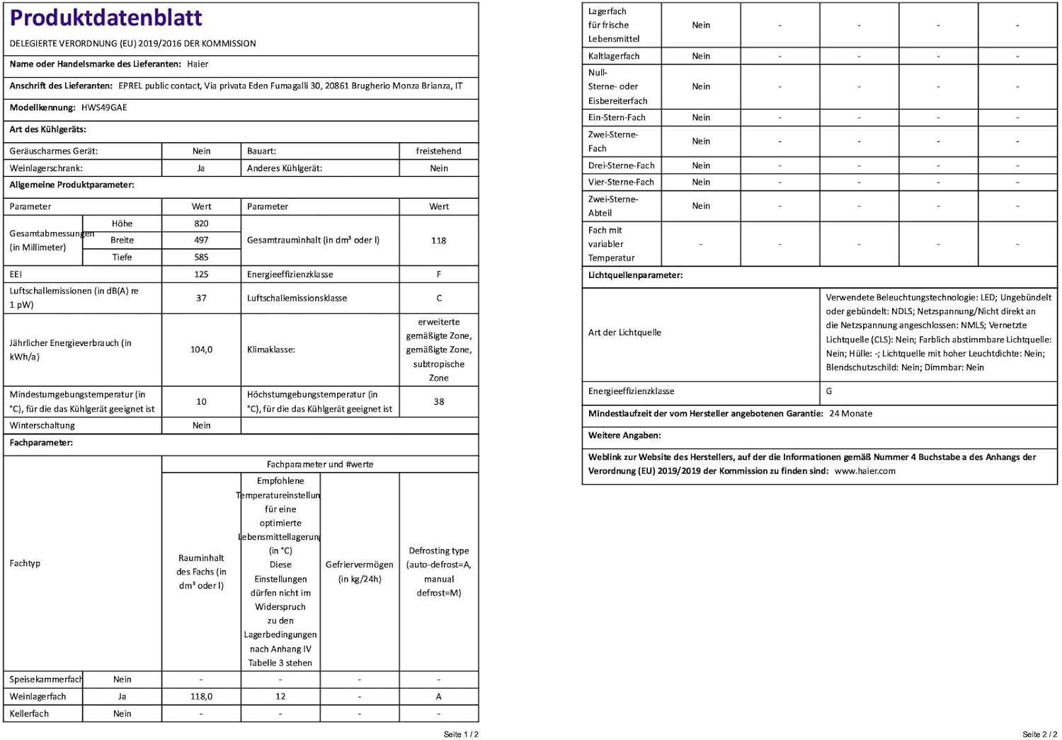 Haier cantinetta vini da 49 bottiglie hws49gae [Classe di efficienza energetica F]