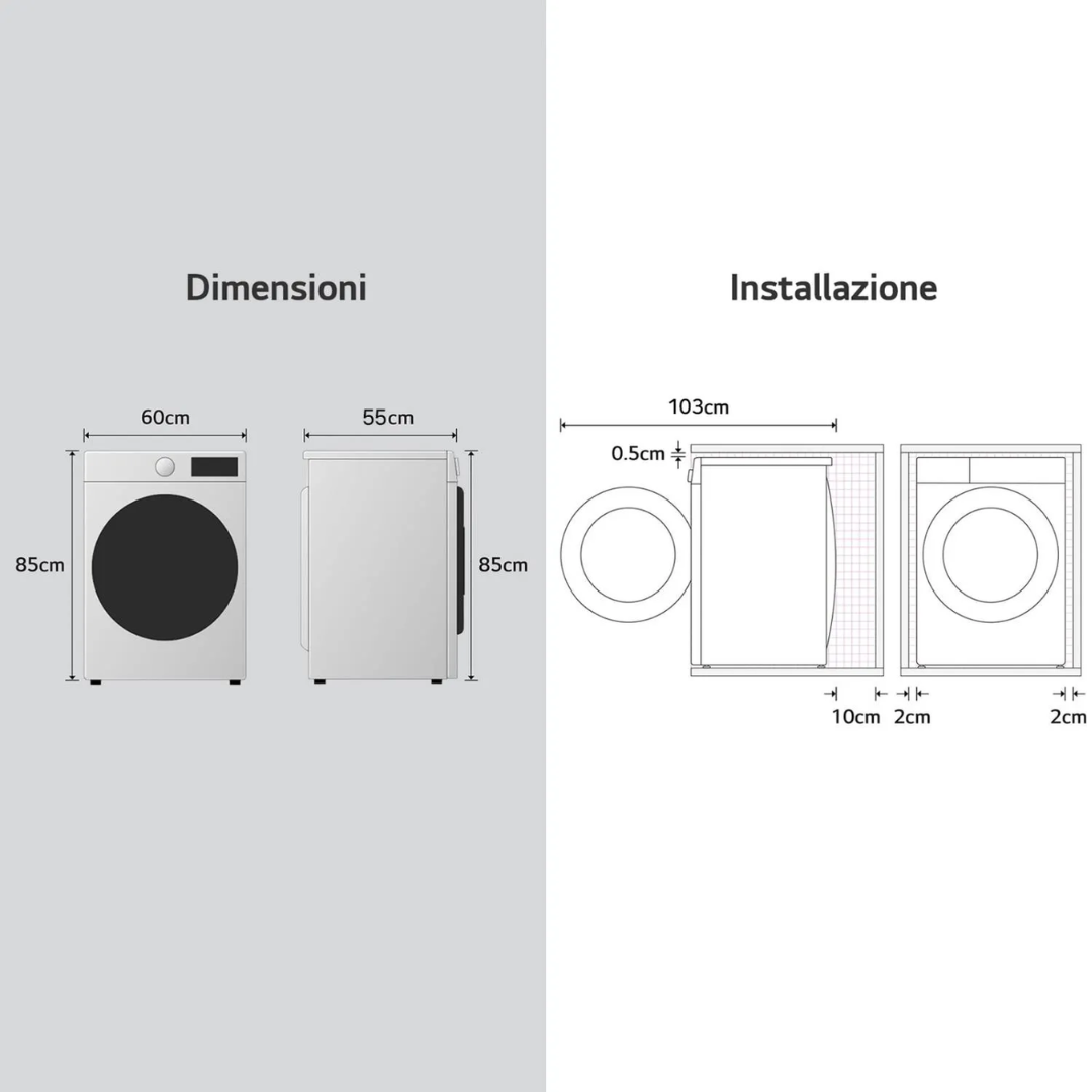 Questa lavatrice si adatta ad ogni ambiente. Puoi installarla così com’è, oppure se devi incassarla sottopiano puoi rimuovere la copertura superiore in modo da avere un’installazione perfetta nel tuo arredamento.