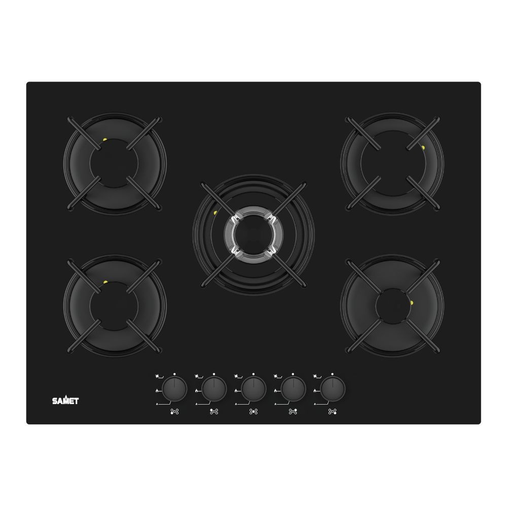 Piano cottura Samet Minerva 70 da incasso a gas 5 fuochi con manopole nere in vetro nero
