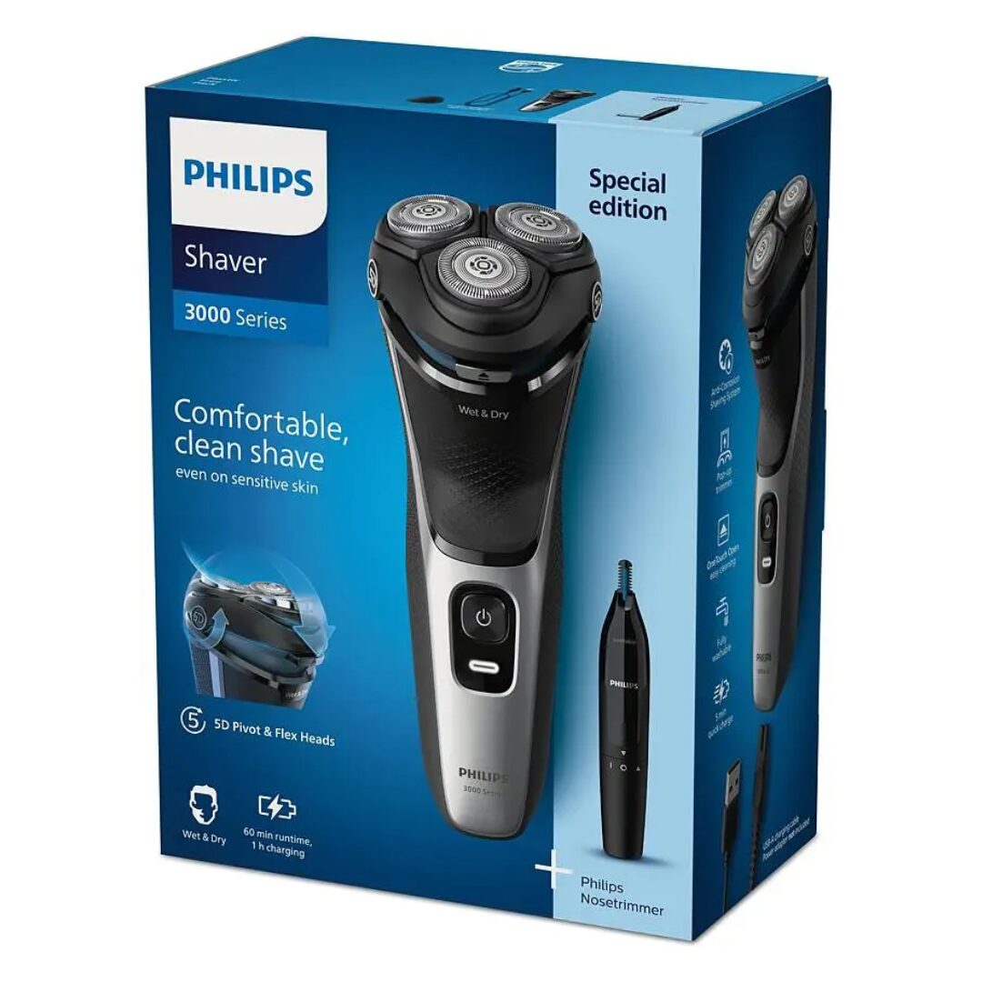 Philips Shaver 3000 Series S3143/02 Rasoio elettrico Wet & Dry. Sistema di rasatura: Rotazione, Tecnologia del sistema di rasatura: PowerCut blade system, Testina di riserva: SH30. Colore del prodotto: Nero, Argento. Alimentazione: Batteria, Tecnologia batteria: Ioni di Litio, Tipo batteria: Batteria integrata. Larghezza: 140 mm, Profondità: 80 mm, Altezza: 190 mm. Pettini: Orecchio, Naso