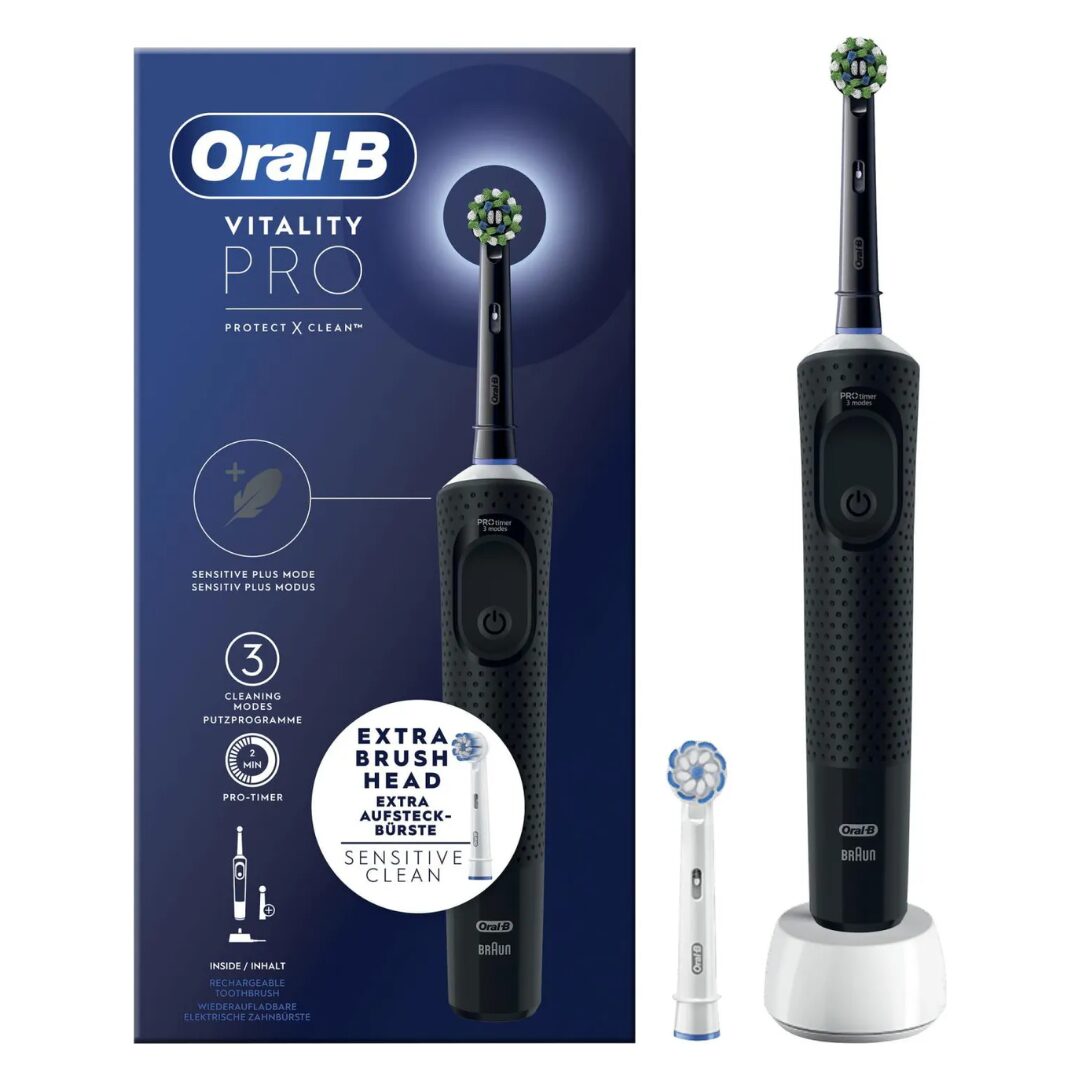 Oral-B Vitality Pro Nero. Utilizzo: Adulto, Tipo di spazzolino da denti: Spazzolino rotante-oscillante, Modalità dello spazzolino: Cura quotidiana, Sensibile, Super sensitive. Alimentazione: Batteria, Tipo batteria: Batteria integrata. Tipo di imballo: Scatola. Numero di spazzolini inclusi: 1 pz, Numero di testine incluse: 2 pz