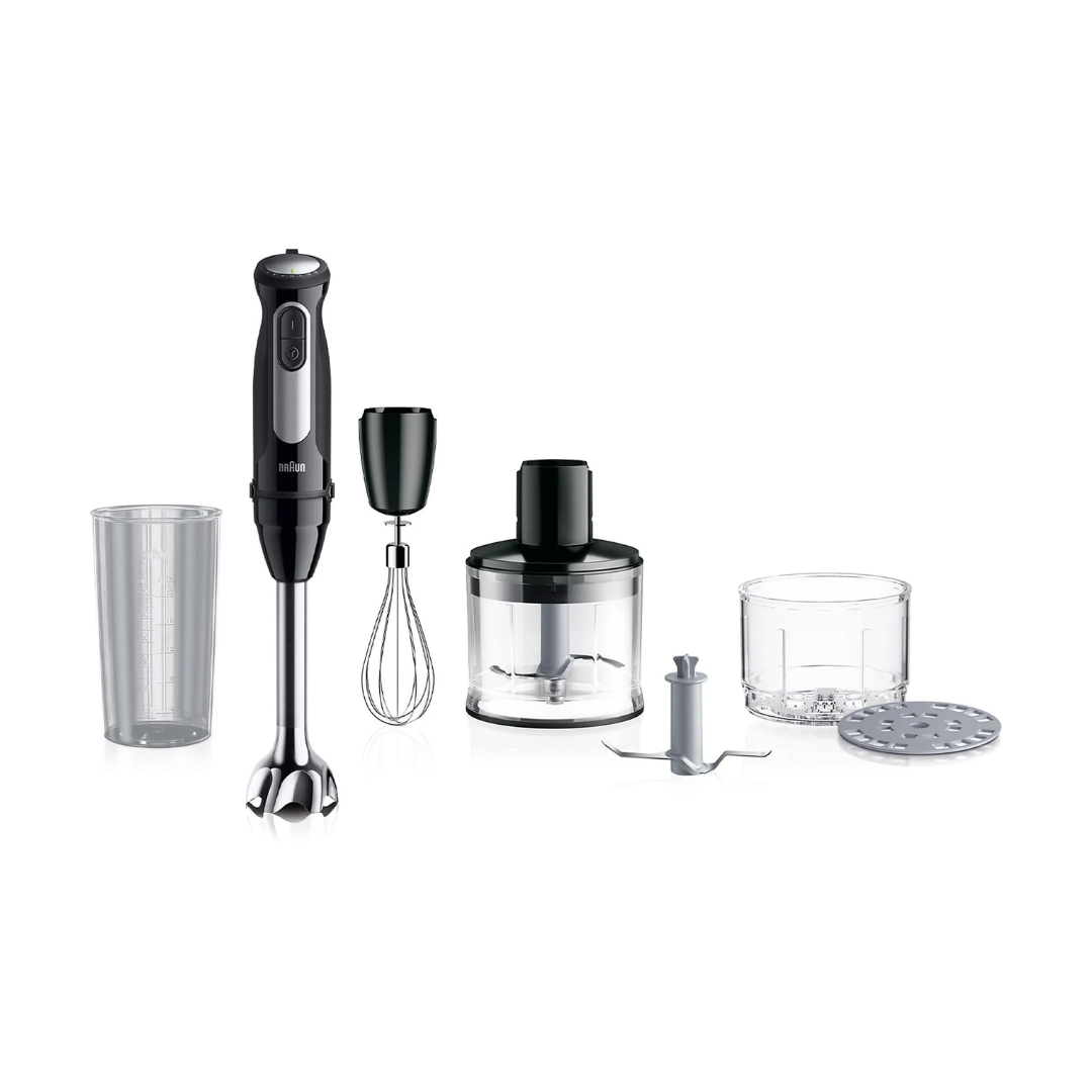 Braun MultiQuick 5 MQ55.254MBK. Tipo: Frullatore ad immersione, Colore del prodotto: Nero, Acciaio inox. Capacità ciotola: 0,5 L, Tipo di controllo della velocità: A gradini, Tipo di controllo: Pulsanti, Manopola. Materiale della ciotola di miscelazione: Plastica, Materiale lama: Acciaio inox. Potenza: 1000 W, Alimentazione: AC. Larghezza: 68 mm, Profondità: 62 mm, Altezza: 208 mmIl Minipimer Braun MultiQuick 5 Pro offre tutto ciò di cui hai bisogno per preparazioni facili e veloci; la sua potenza di 1000W infatti ti aiuterà a tritare qualsiasi ingrediente senza sforzi, anche grazie alle 25 velocità regolabili con una sola mano che ne facilitano l’utilizzo. Lame in acciaio inox con tecnologia PowerBell Plus, con un’area di taglio più ampia per tritare cibo intero in pochi secondi assicurandoti risultati eccezionali e campana con sistema anti schizzo per mantenere la tua cucina sempre pulita. Preciso e versatile, offre una ricca dotazione che comprende una frusta a filo per montare, il nuovo accessorio tritatutto SiziControl che ti permette di sminuzzare in 3 diverse grandezze e di tritare anche il ghiaccio e un bicchiere graduato da 600ml. Tutti gli accessori sono facilmente intercambiabili grazie al sistema EasyClick Plus. Braun MultiQuick 5 Pro, massima potenza e pieno controllo!