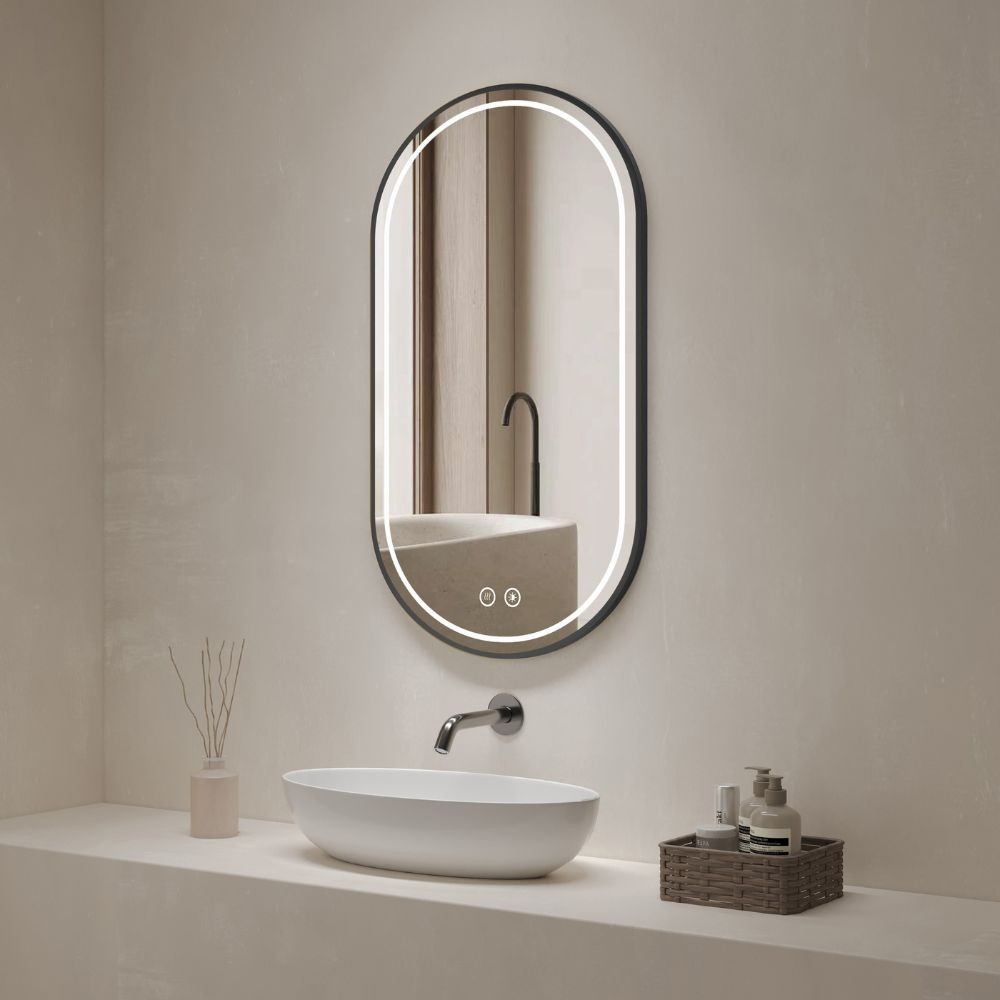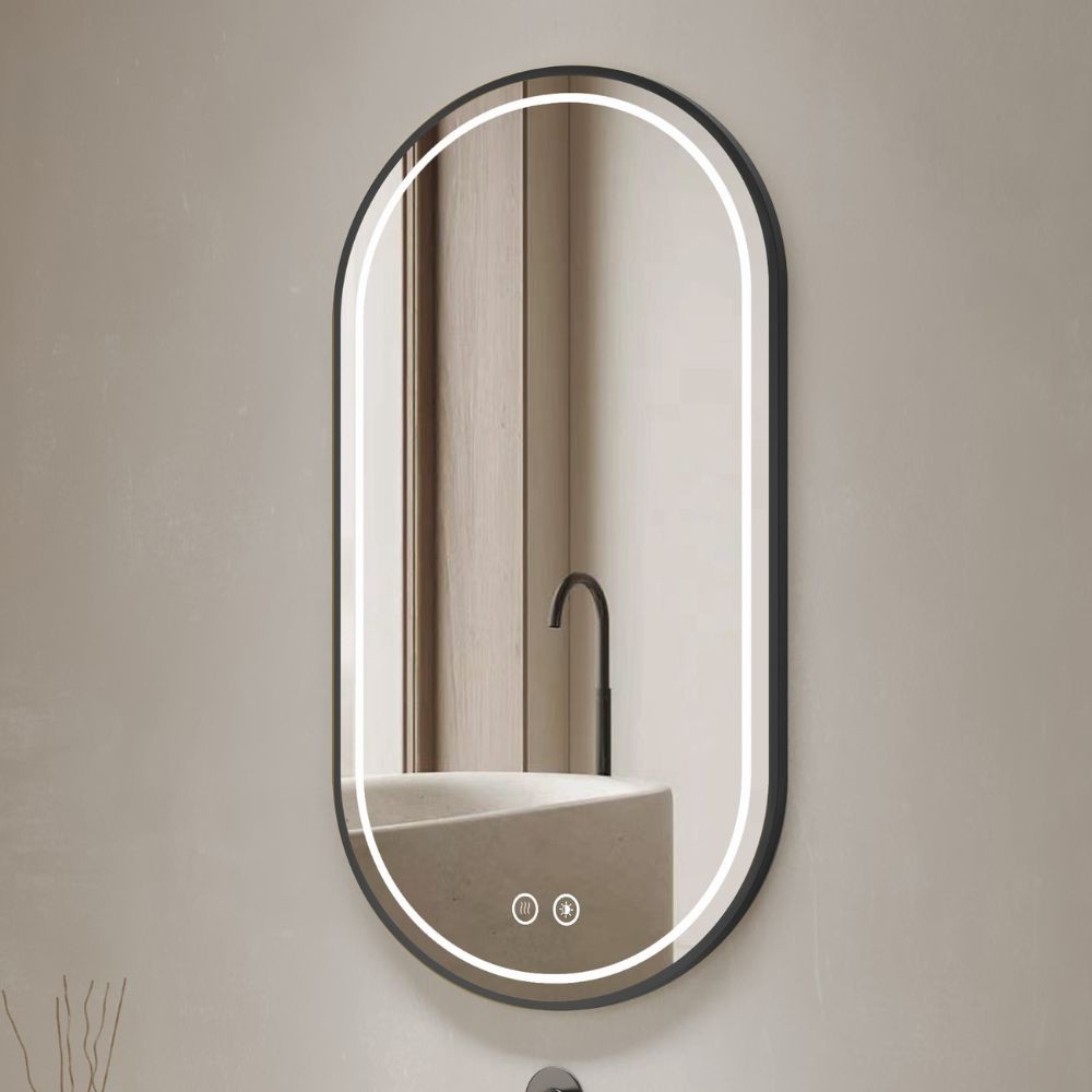 Specchio ovale con luci regolabili e cornice nera in acciaio. Perfetto per il bagno, elimina l'appannamento e ti illumina come preferisci...