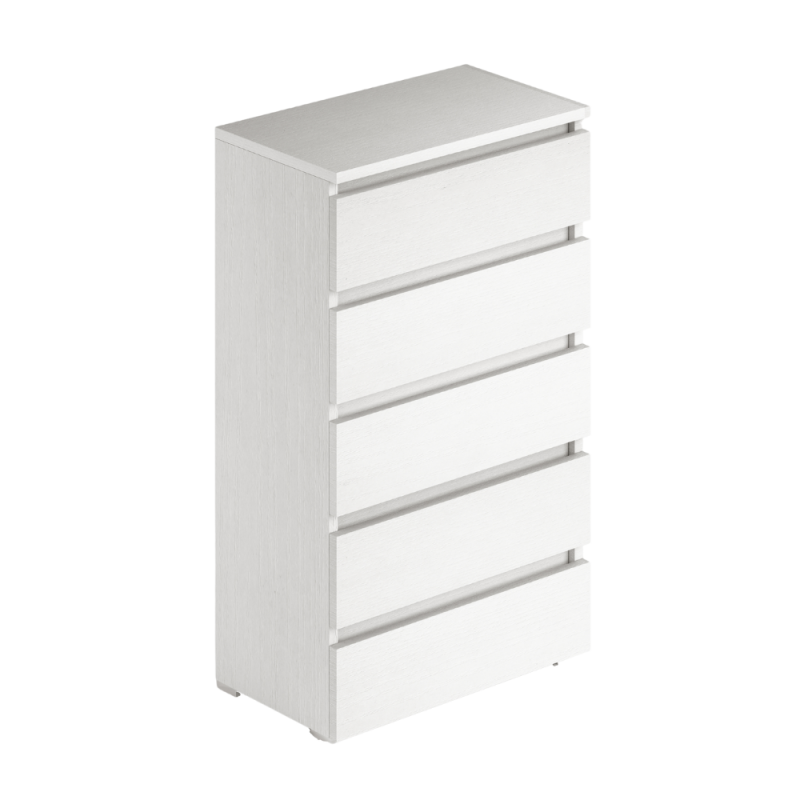 Cassettiera in legno bianco con 5 cassetti capienti, perfetta per organizzare camera e soggiorno. Pratica e funzionale, già montata.