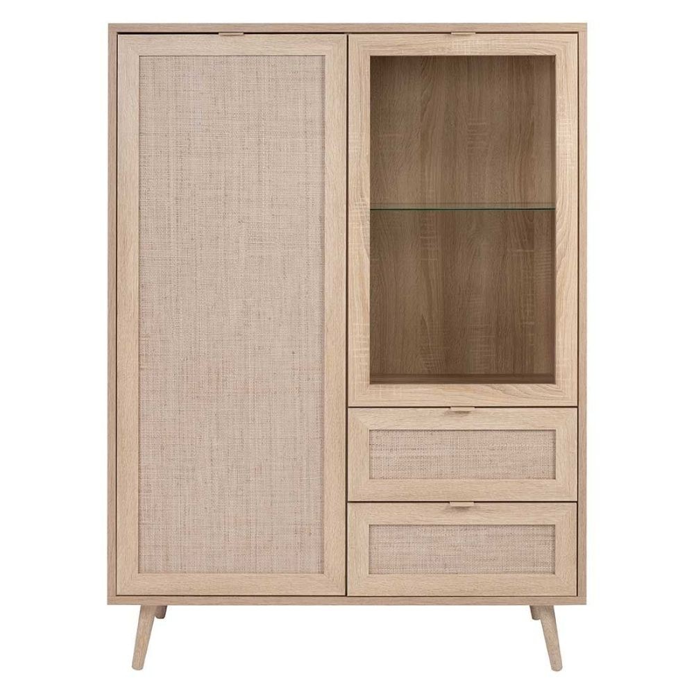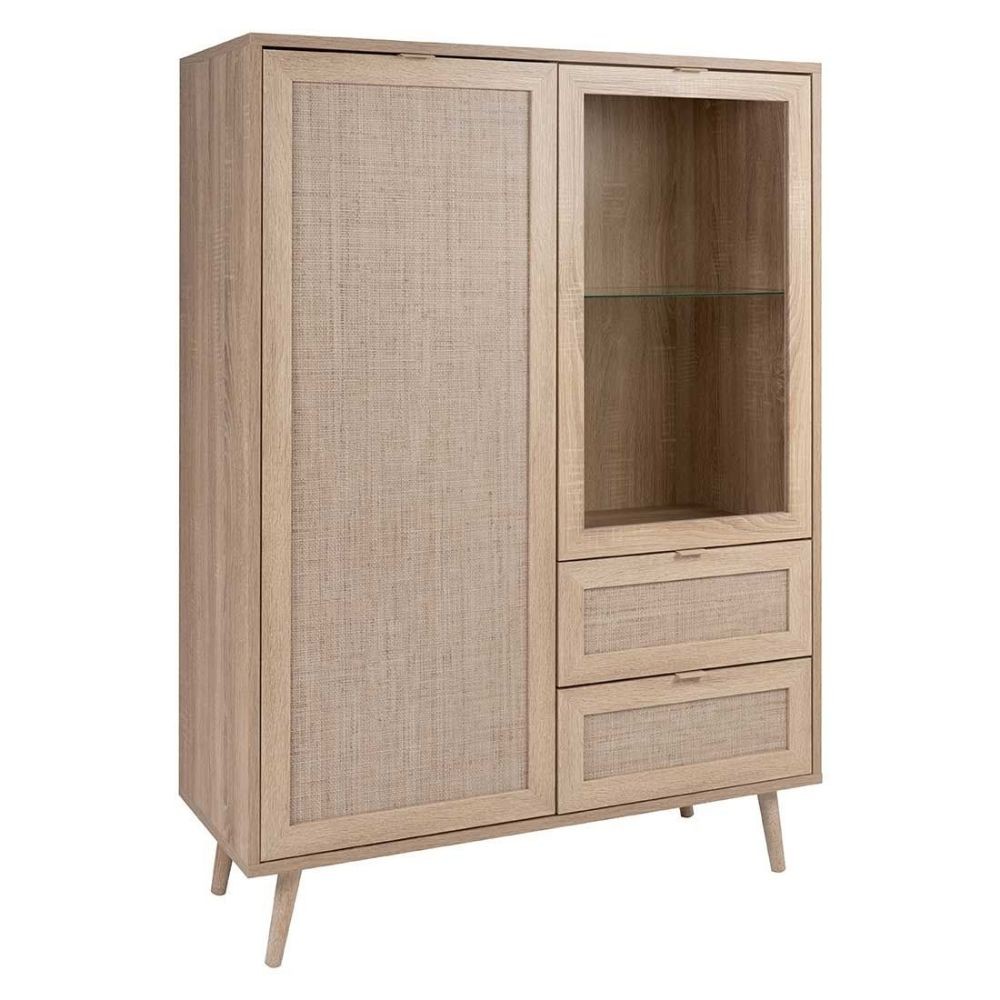 Credenza con ante in vimini e vetro, 2 cassetti e ripiani regolabili. Legno quercia naturale, design elegante e funzionale per soggiorno ...