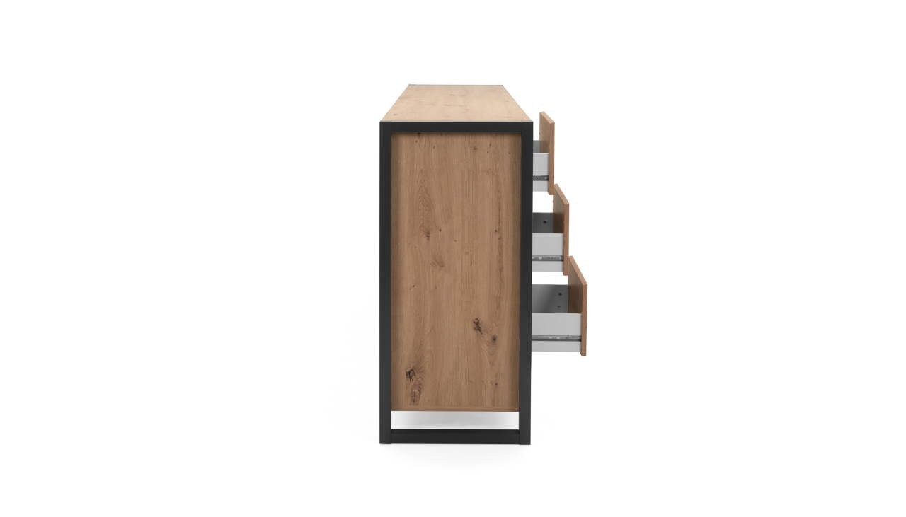 La madia Denver 3 è composta da 3 ante e 3 cassetti. La scocca, le ante e gli interni della madia sono in finitura quercia, mentre i profili e i particolari sono colore antracite. All’interno del mobile troviamo un comodo ripiano. I cassetti sono solidi e capienti.