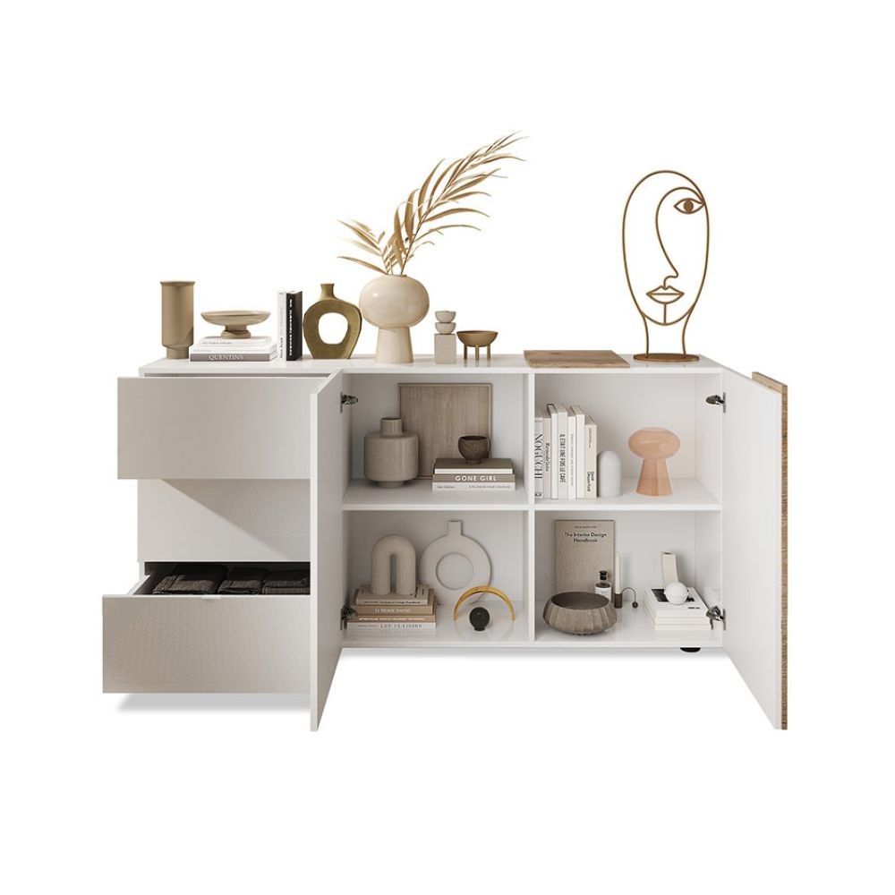 Madia moderna con 2 ante e 3 cassetti in bianco lucido, perfetta per organizzare soggiorno e camera con stile e praticità.