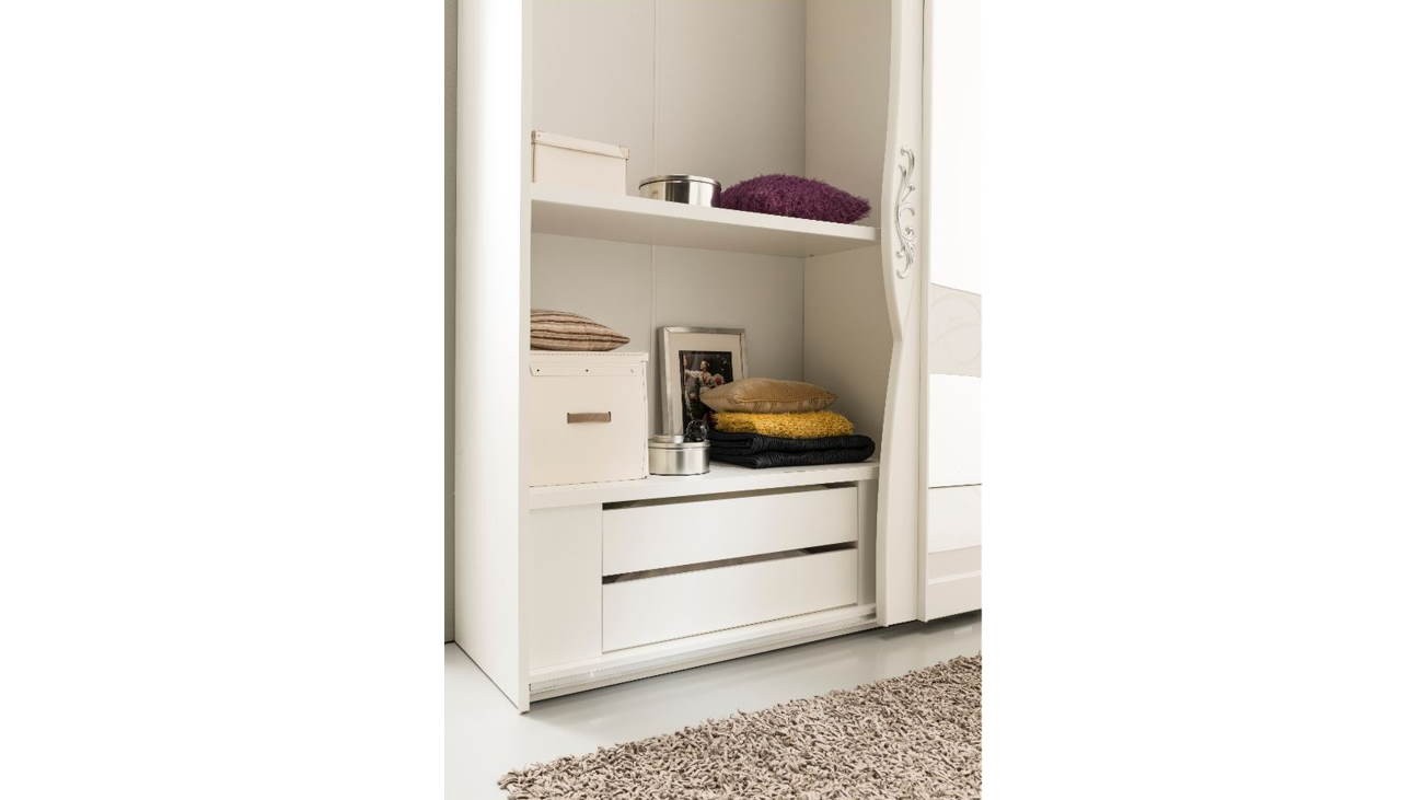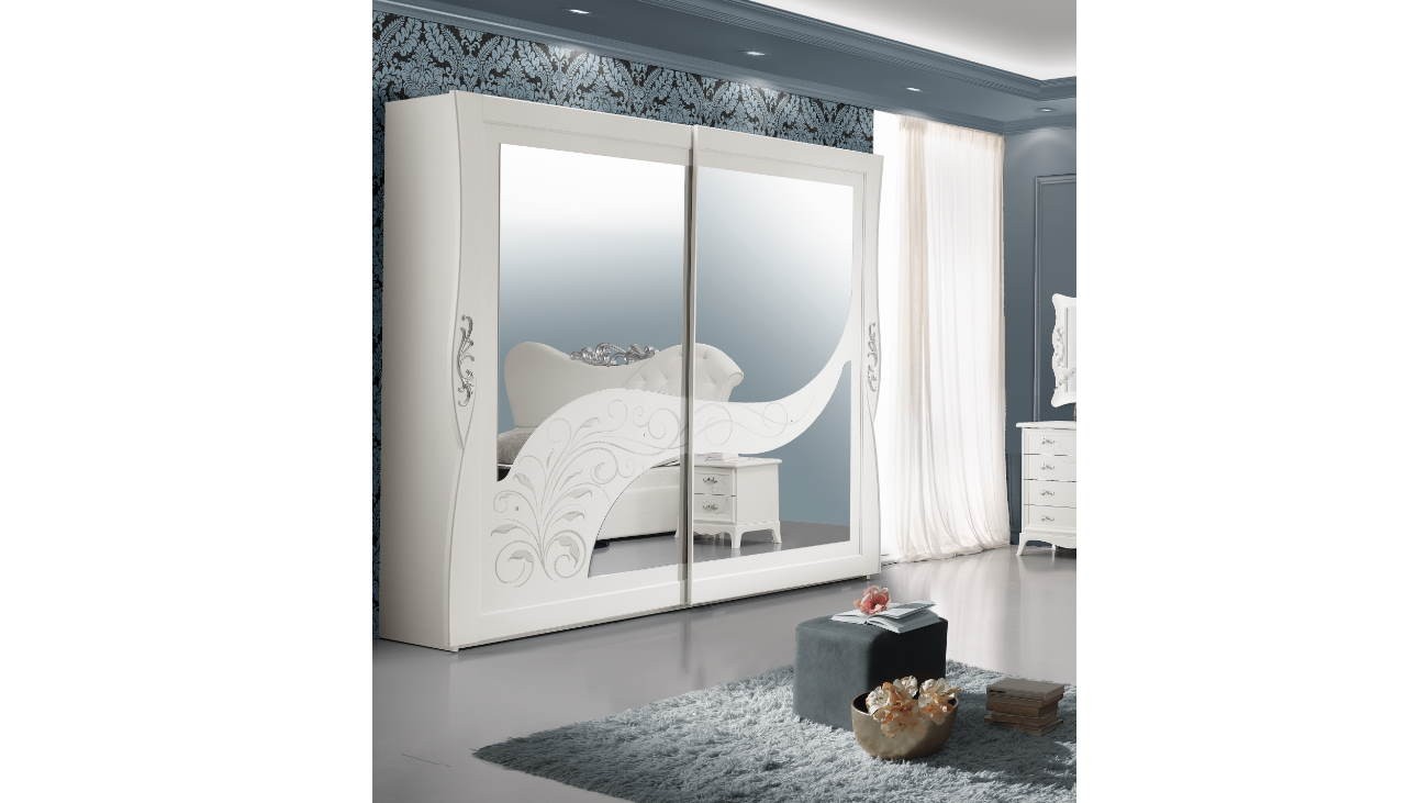 Armadio 2 ante scorrevoli con specchi. Spessore fianchi e ripiani 25 mm. Base, cappello e tramezzi spessore 18 mm. Dotato di piedini regolabili, ammortizzatori, barra di rinforzo e cassettiera interna 2 cassetti.