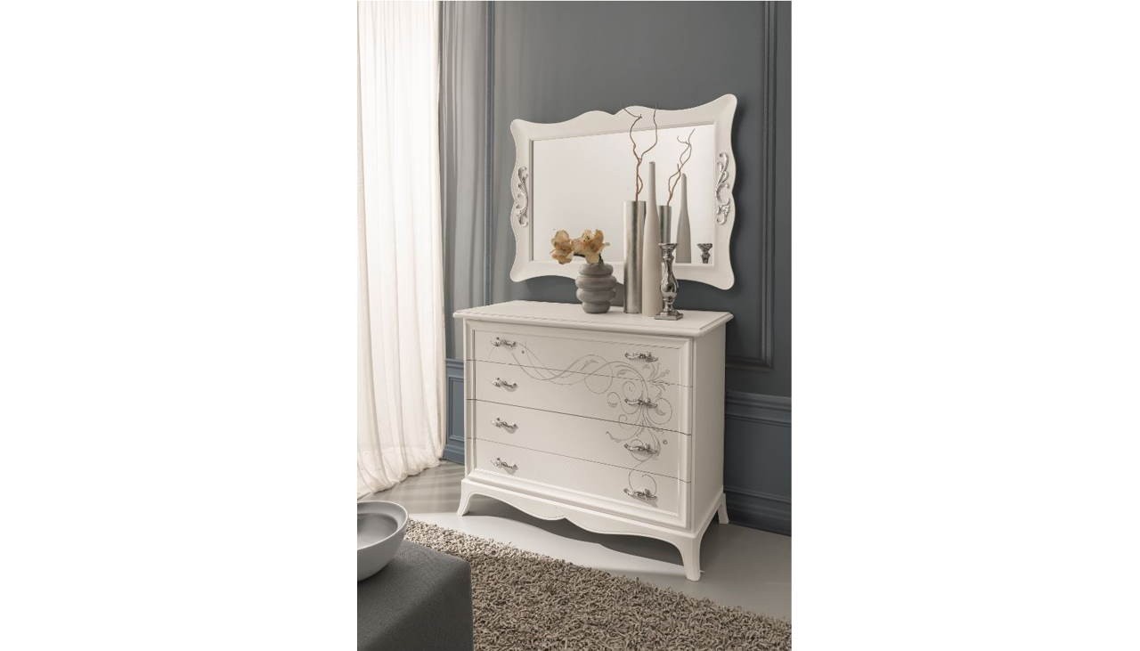 Comò 4 cassetti con guide metalliche e frontali impreziositi da decoro.