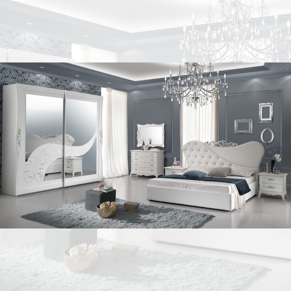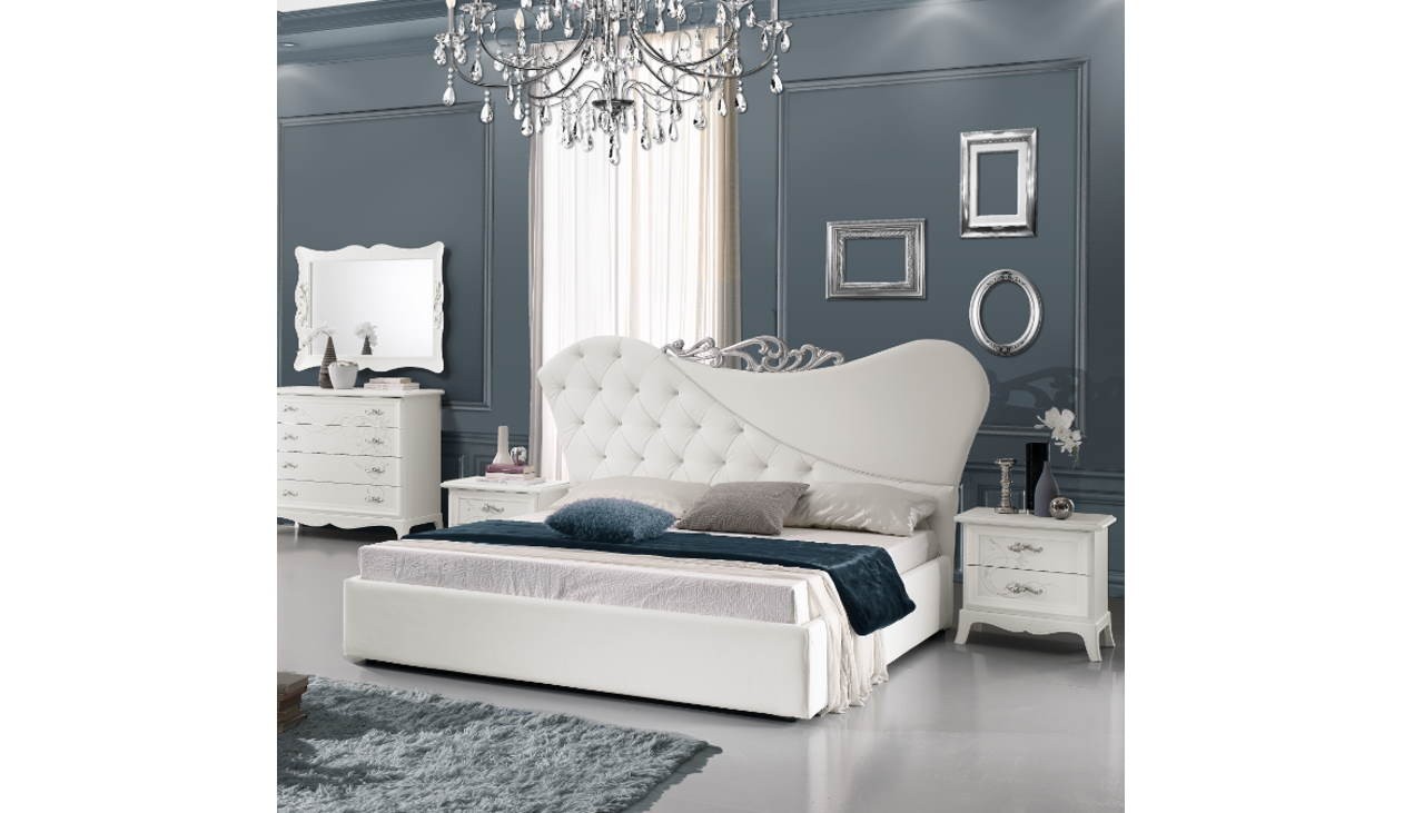Letto matrimoniale con testata imbottita, con fregio colore argento e parziale lavorazione capitonnè. Conteniotre con rete inclusa