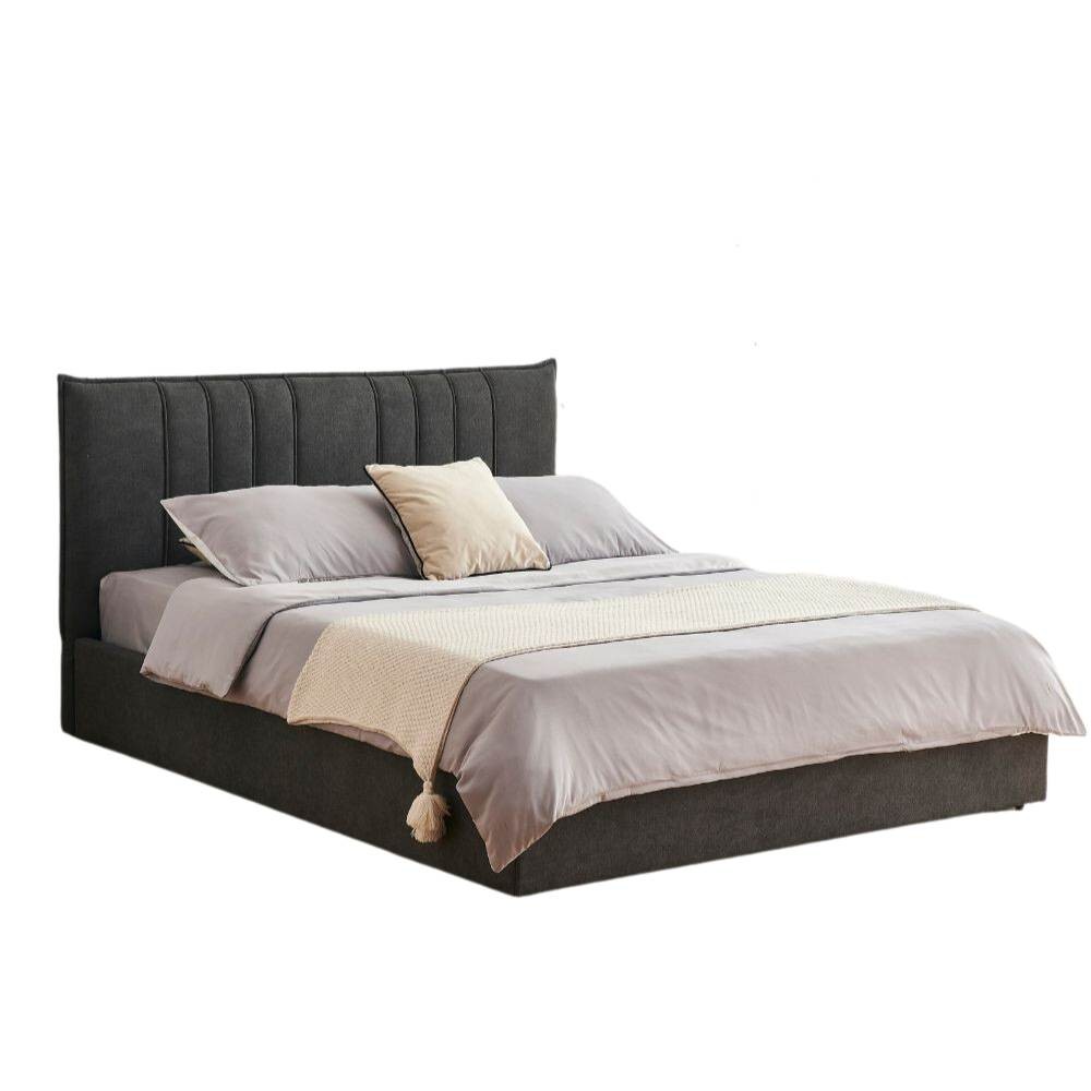 Letto matrimoniale contenitore Saturno con testiera imbottita e rivestimento tessuto grigio scuro.