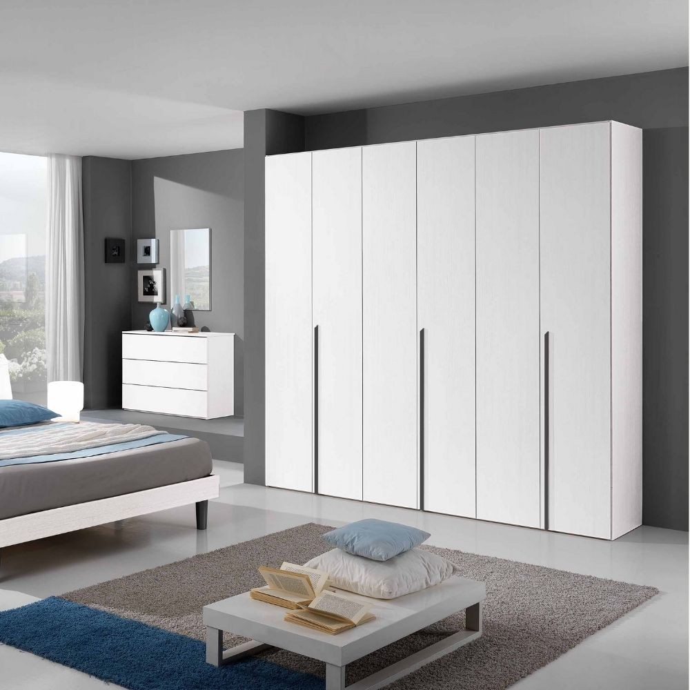 Armadio 6 ante battenti. Spessore fianchi 18 mm. e ripiani 22 mm. Struttura colore bianco e frontali bianco frassinato.