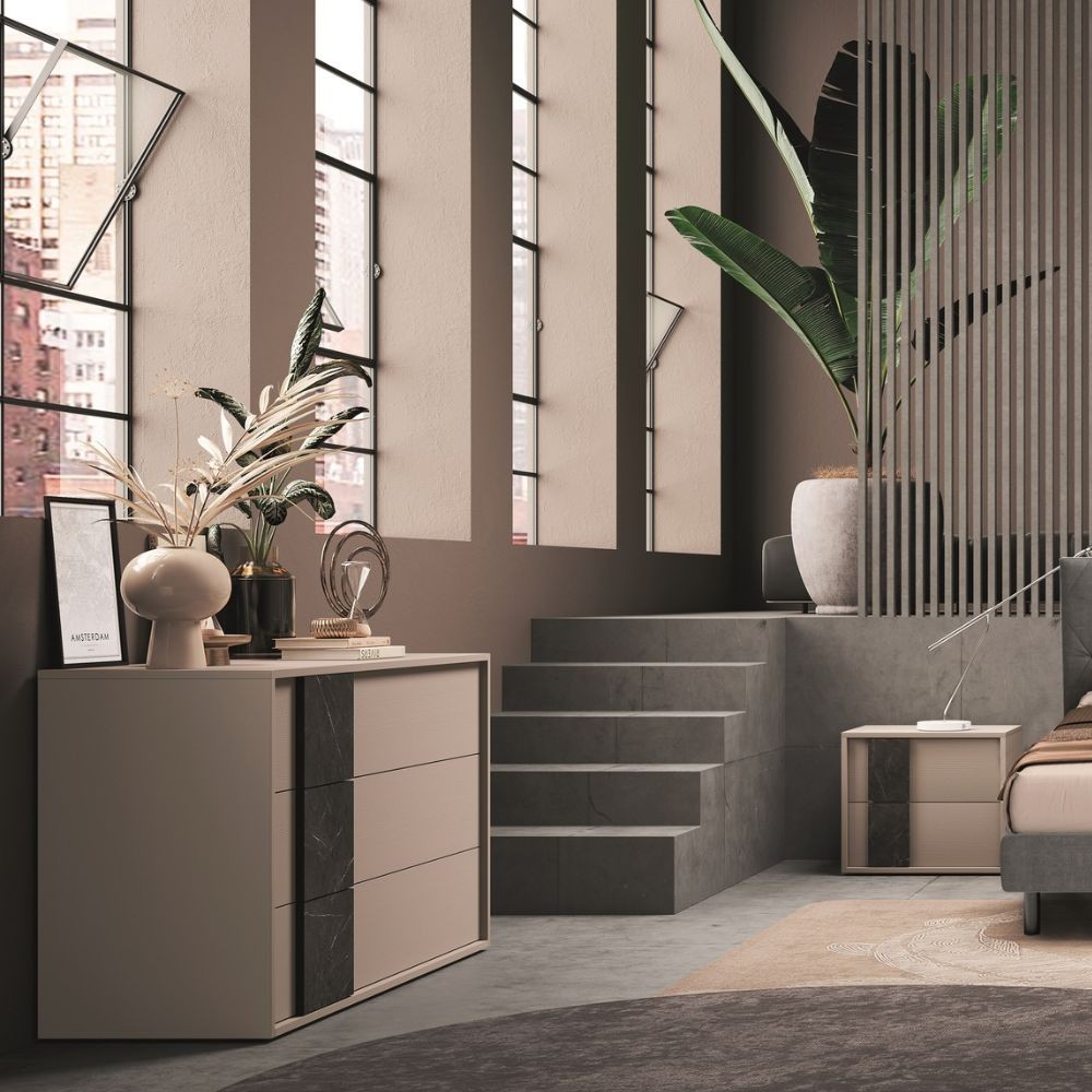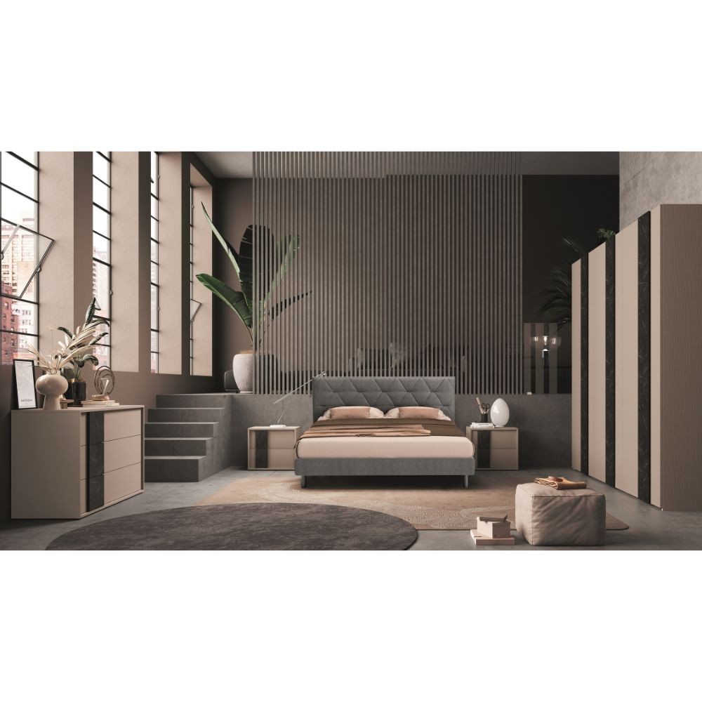Camera completa in canapa naturale con dettagli marmo nero, include letto contenitore, armadi capienti e comò. Design moderno Made in Ita...