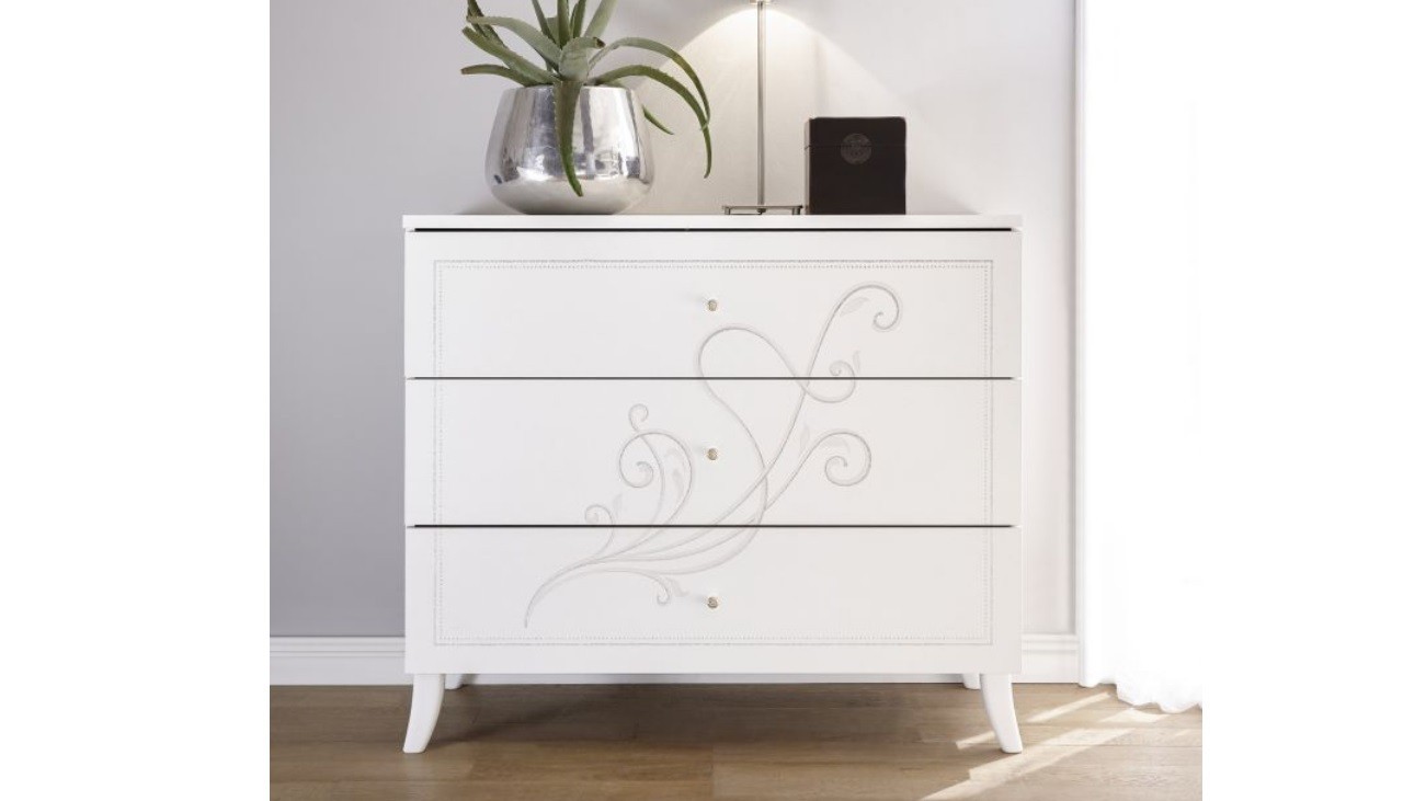 Comò 3 cassetti con decori e guide metalliche.
