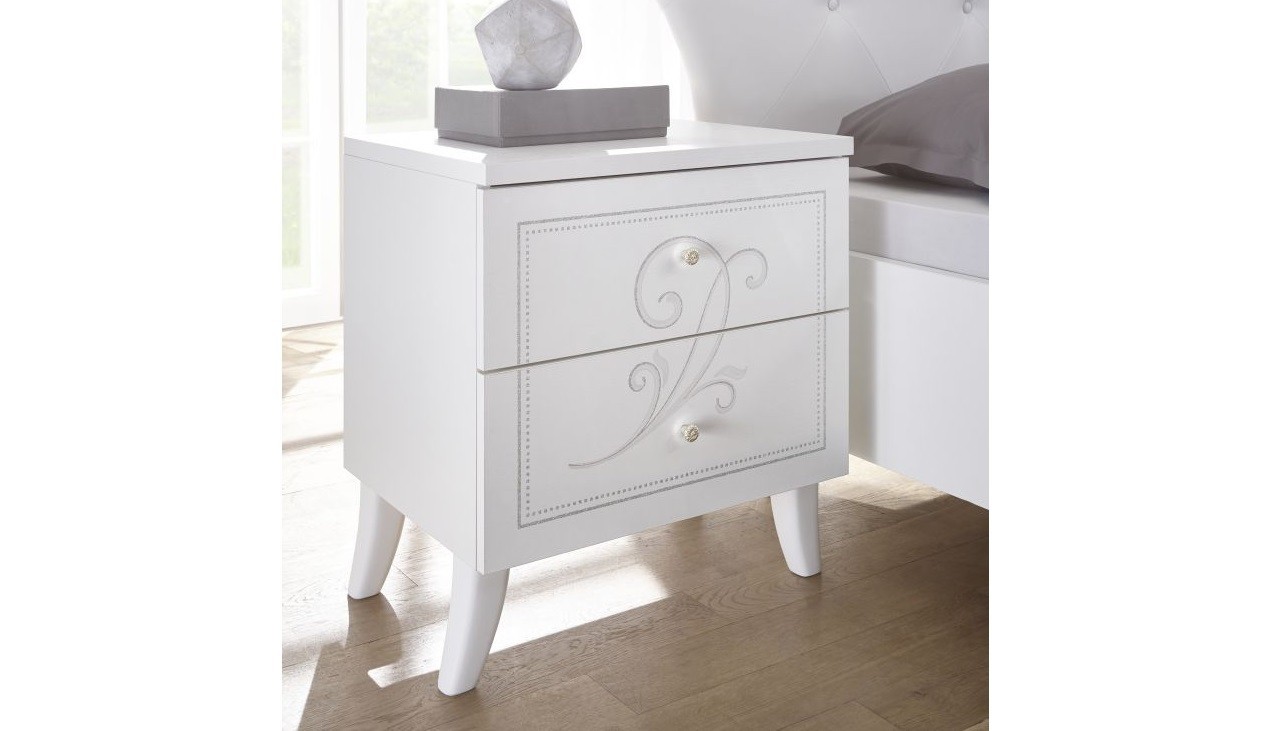 Comodini 2 cassetti con decori e guide metalliche.