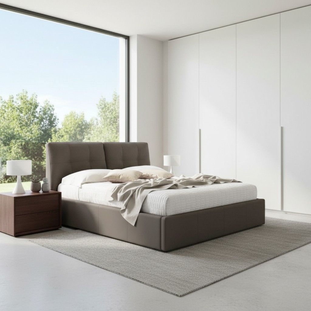 Letto matrimoniale in ecopelle tortora con cassettone sottostruttura e testiera trapuntata, perfetto per riposare bene e organizzare lo s...