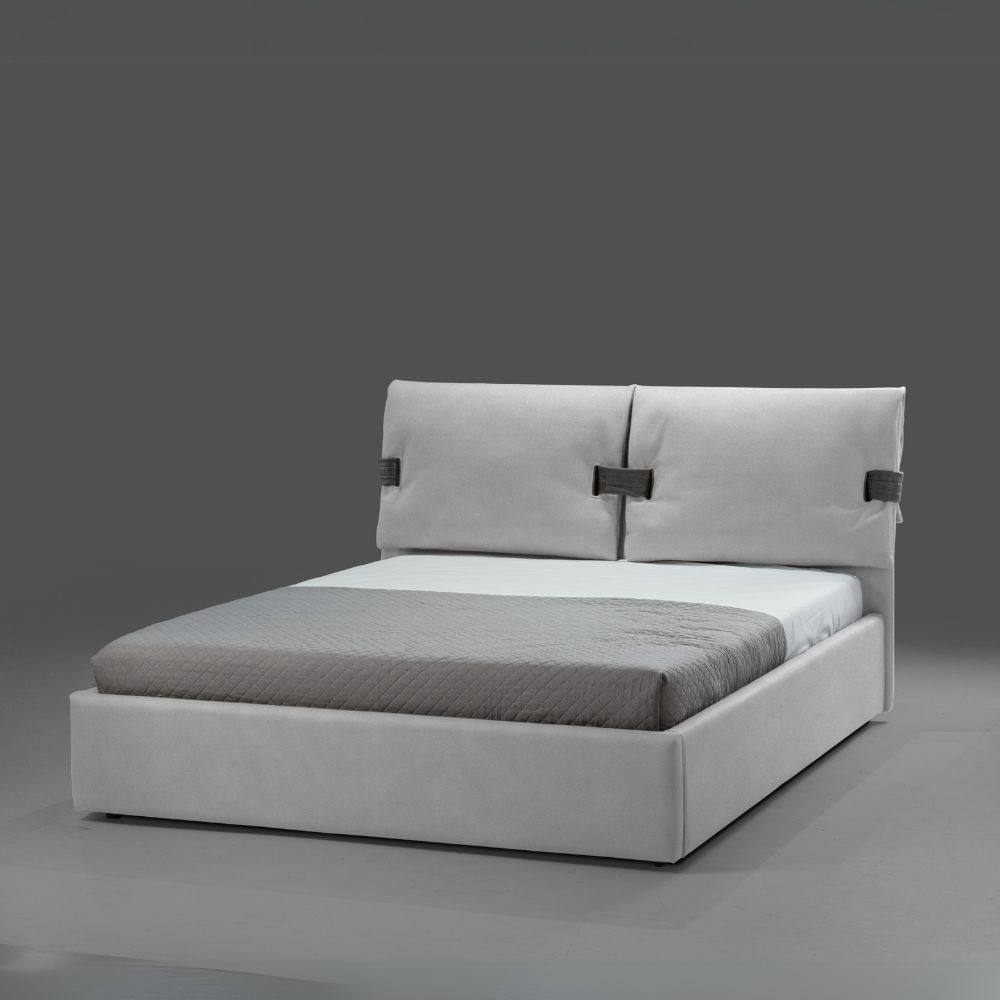Letto matrimoniale con contenitore in tessuto grigio, pratico e spazioso per riporre coperte e cuscini sotto il letto.