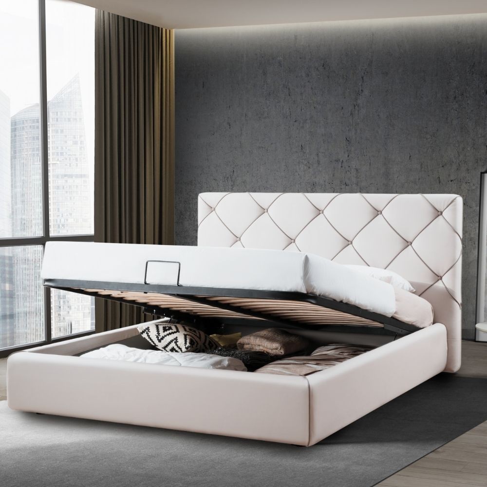 Letto matrimoniale con contenitore e testiera trapuntata in ecopelle bianca. Riposa comodamente e conserva biancheria sotto il materasso.