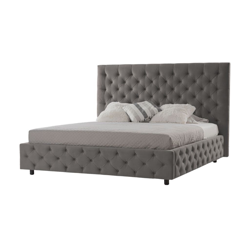 Letto matrimoniale grigio con vani contenitori sotto il materasso. Testiera e sponde trapuntate per un comfort morbido. Rete a doghe incl...