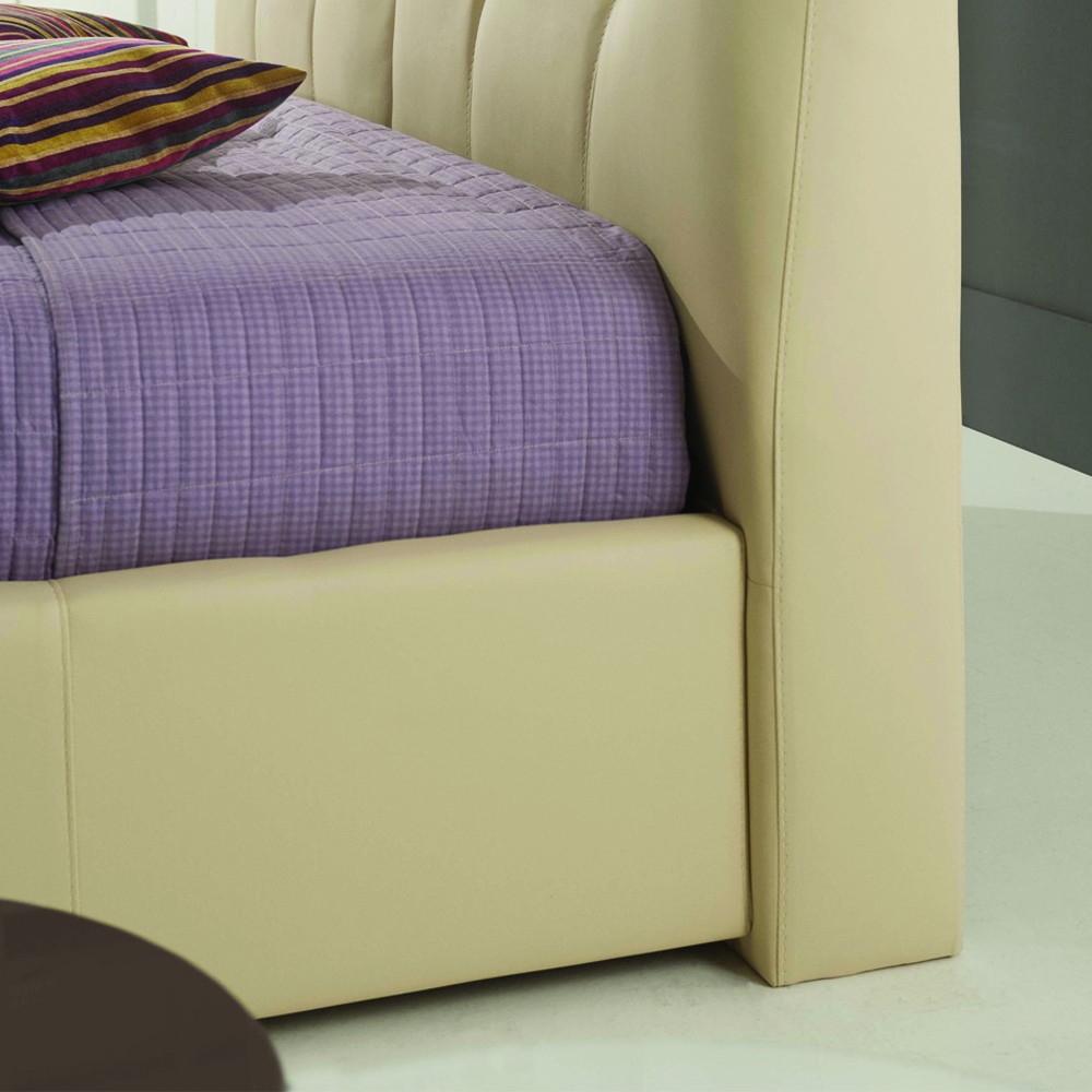 Letto matrimoniale con contenitore in ecopelle crema, testiera trapuntata e ampio vano per riporre biancheria e cuscini sotto il materasso.