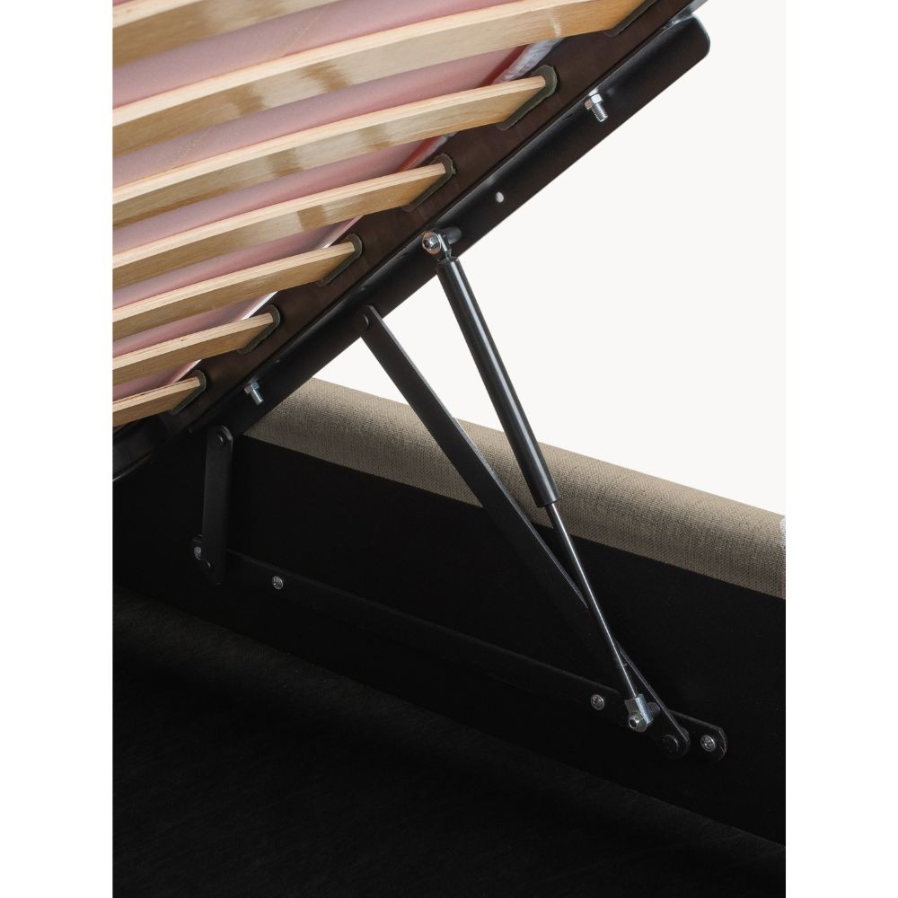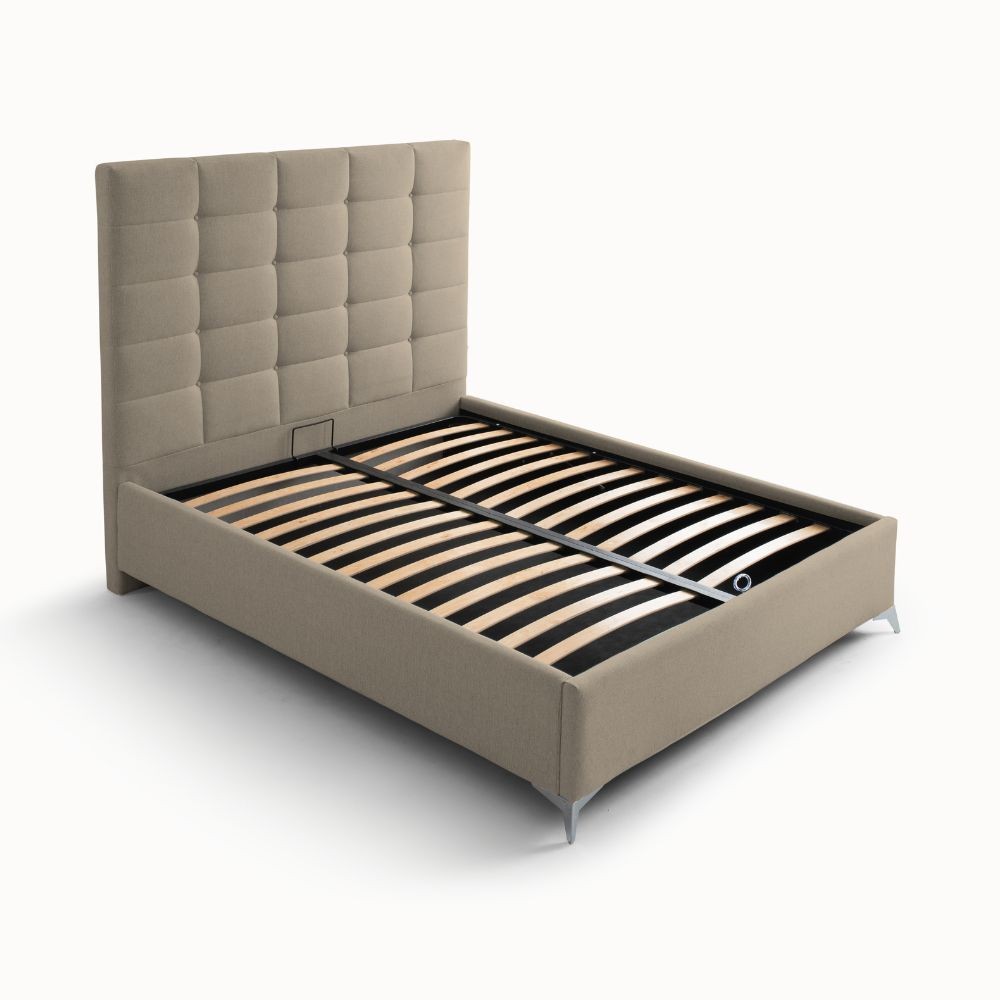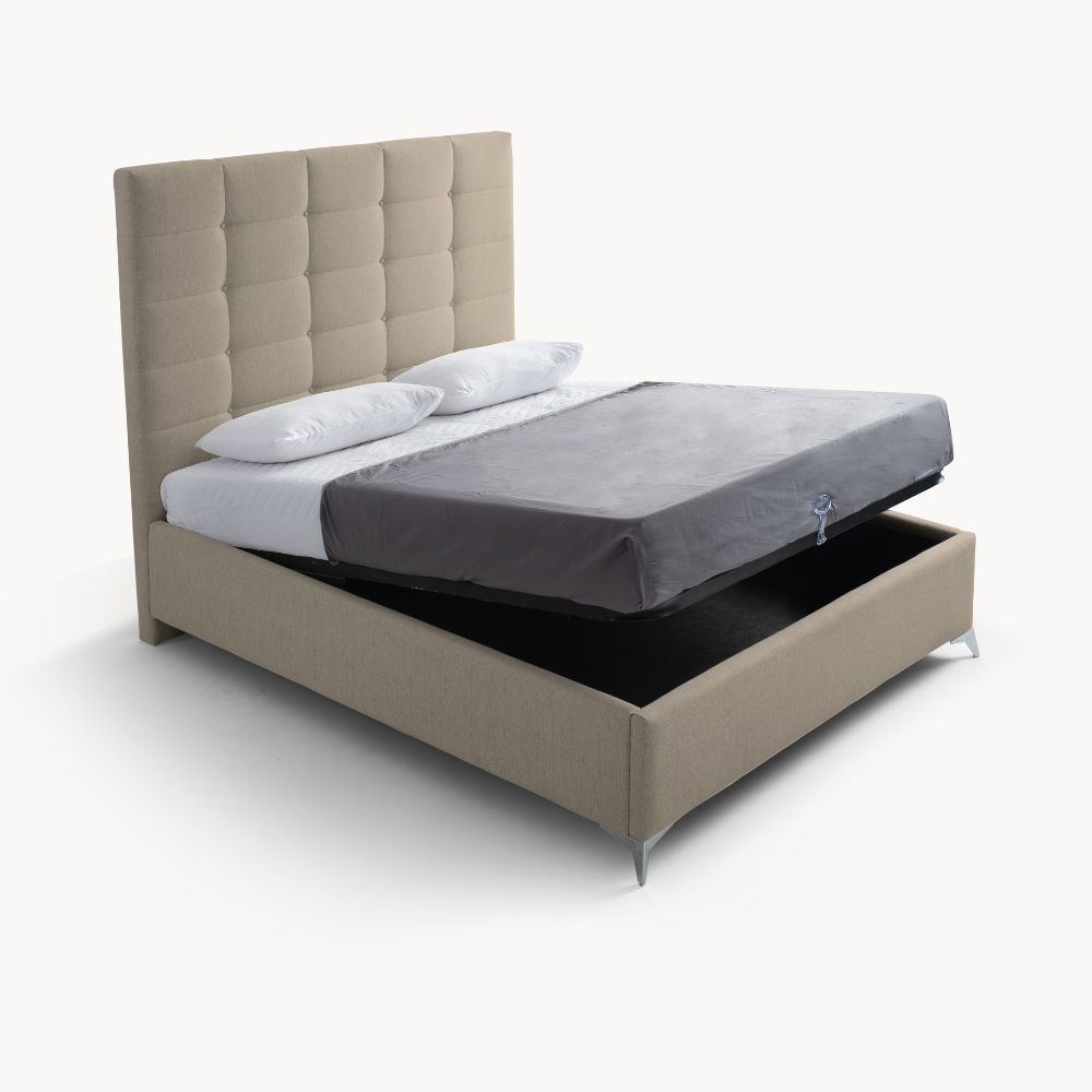 Letto matrimoniale imbottito con contenitore e testiera trapuntata, in tessuto facile da pulire. Comfort e praticità in camera da letto.