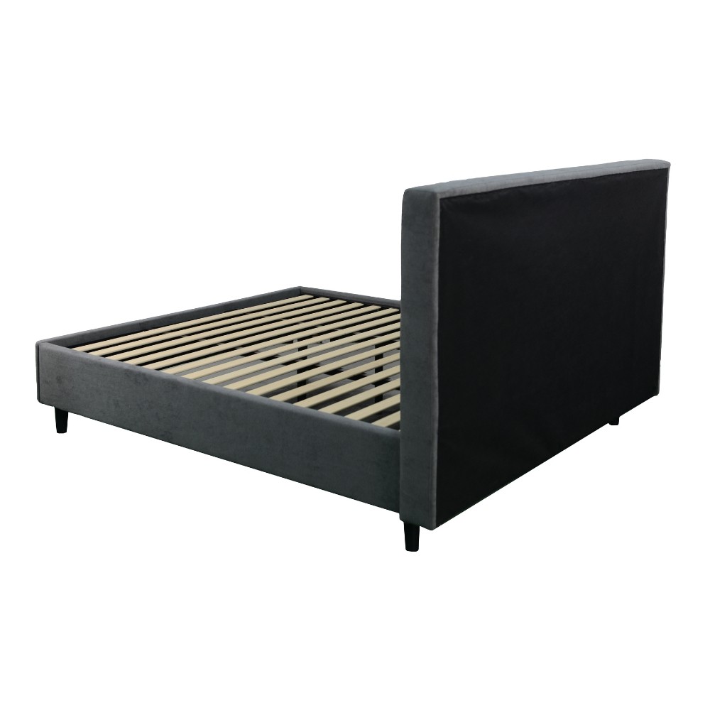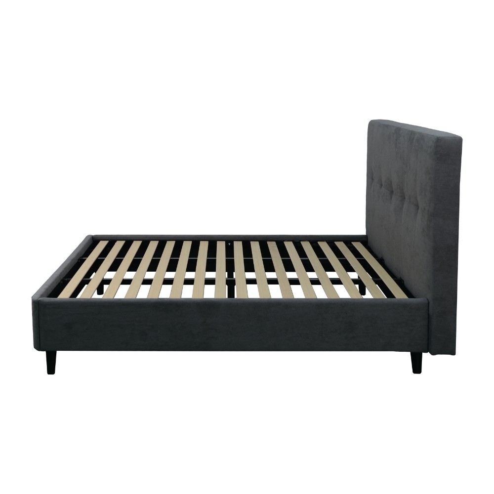 Letto matrimoniale imbottito in tessuto grigio con rete fissa inclusa, perfetto per arredare la camera con stile e comodità garantita.