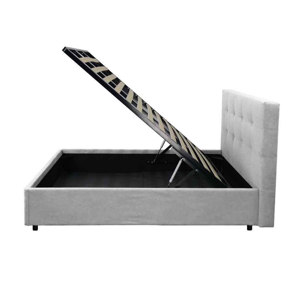 Letto singolo contenitore in tessuto grigio chiaro con testiera imbottita. Spazio salvaspazio sotto il letto per riporre biancheria e ogg...