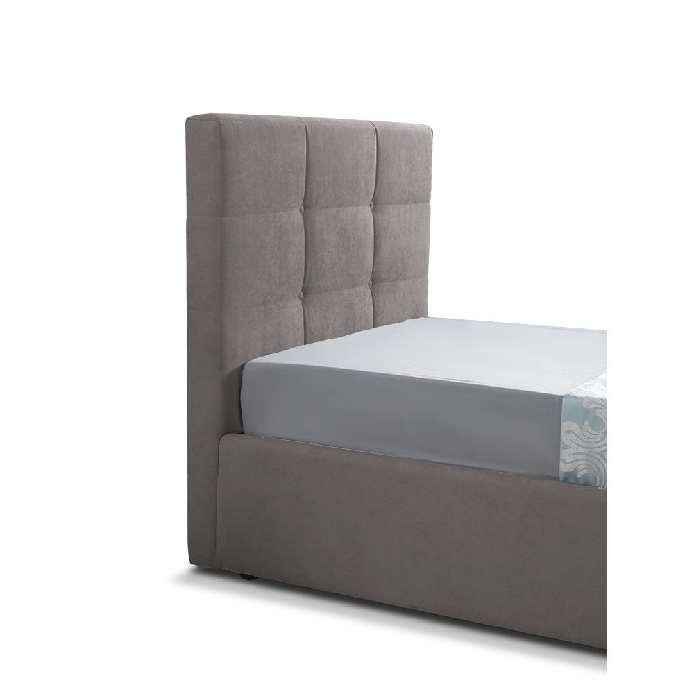 Letto singolo tortora con contenitore e rete, perfetto per piccoli spazi. Rivestimento resistente che dura nel tempo.