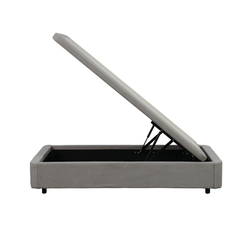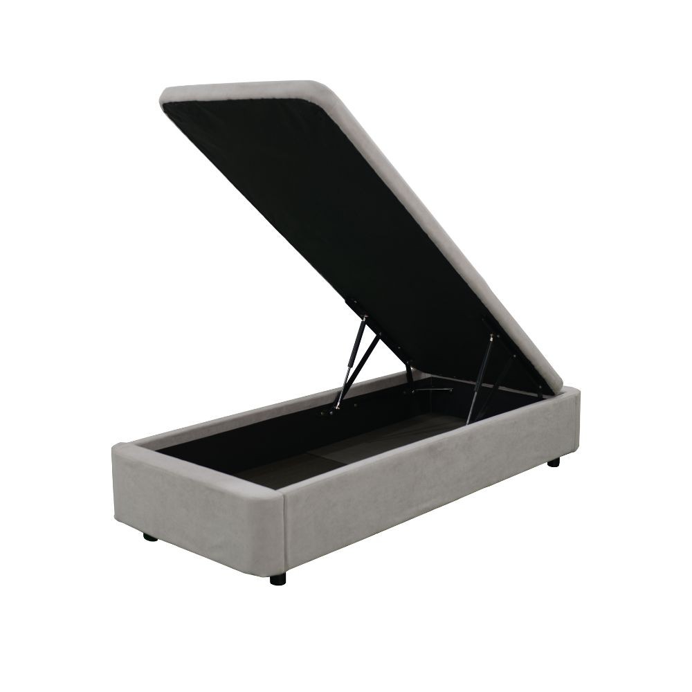 Letto singolo contenitore in tessuto grigio con spazio interno per riporre biancheria e oggetti. Pratico e funzionale.