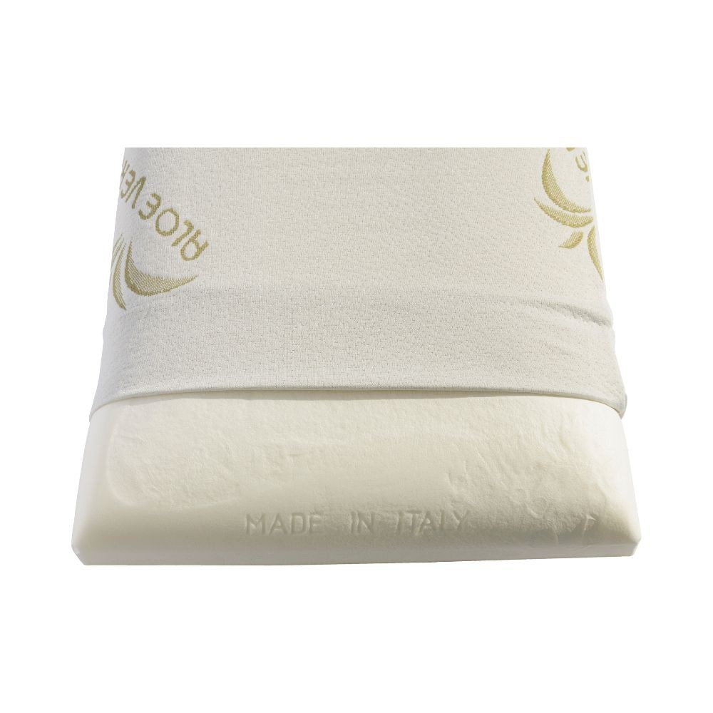Guanciale in memory foam naturale e anallergico con fodera in aloe vera. Sostiene il collo per un riposo profondo e rigenerante ogni notte.