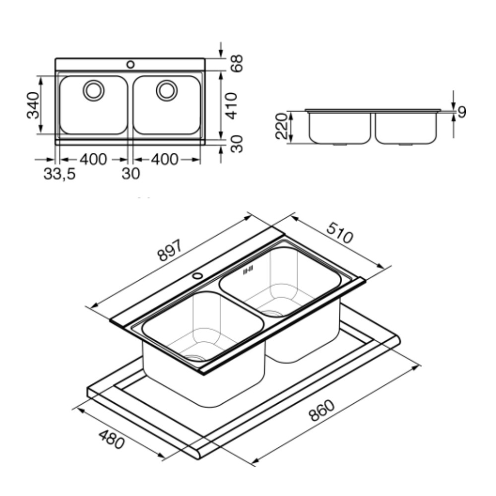 Dimensioni foro incasso sopratop : 860×480 mm.