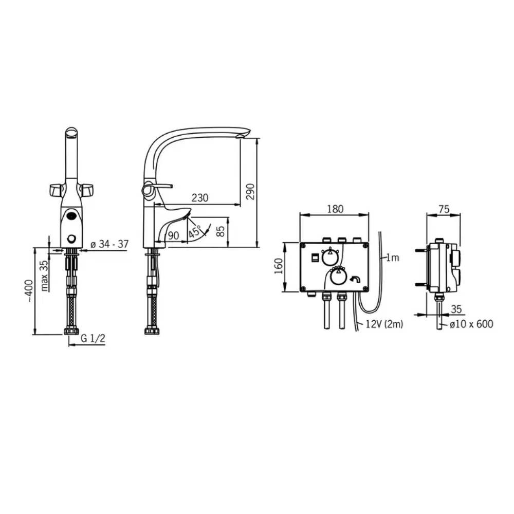 La temperatura dell’acqua per la funzione touchless è regolata da una centralina posta sotto il lavello. L’unità di controllo è dotata di attacco per lavastoviglie. Opzioni di acqua calda e fredda disponibili per la lavastoviglie. I valori preimpostati per l’intervallo di riconoscimento e il periodo di flusso sono regolabili in loco. Collegamento elettrico con trasformatore a spina 230/12 V. Tubi di collegamento ø10 x 600 (2 pz) tra i tubi di ingresso e la centralina. Il rubinetto è dotato di filtri lettiera e valvole di non ritorno.