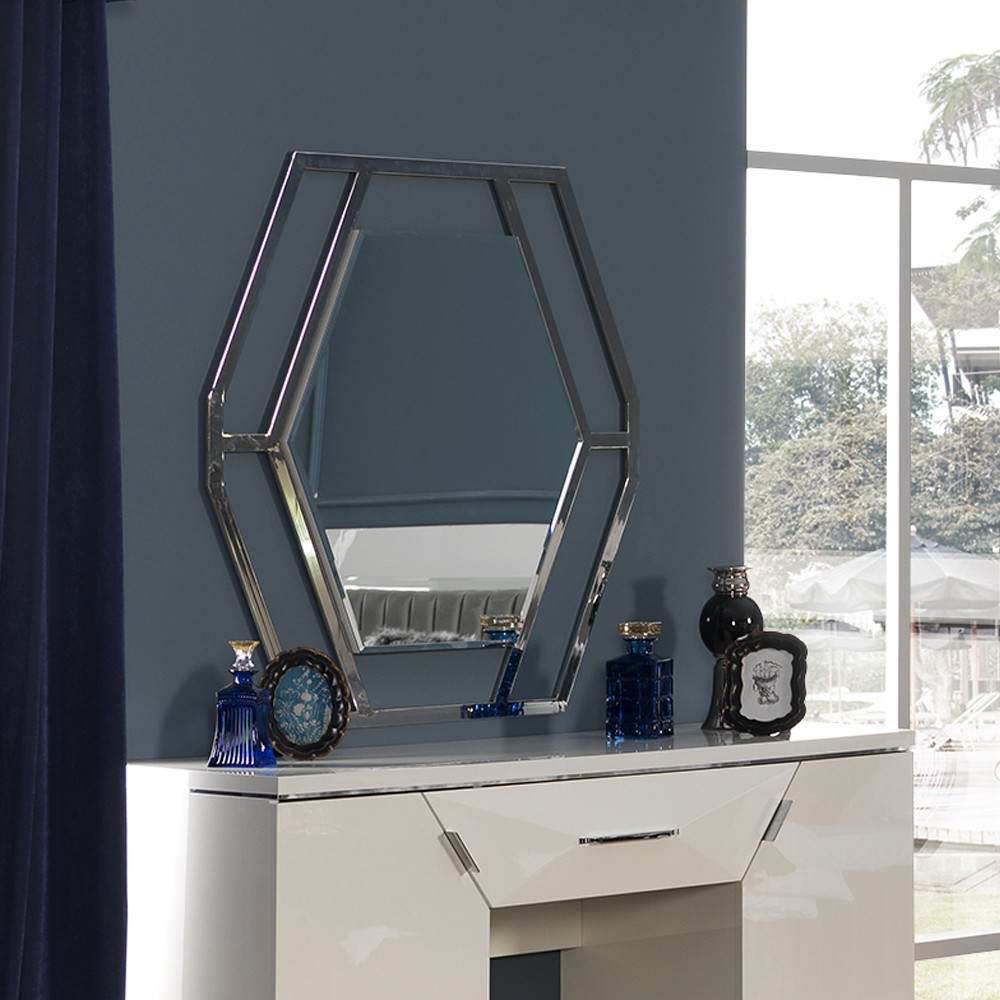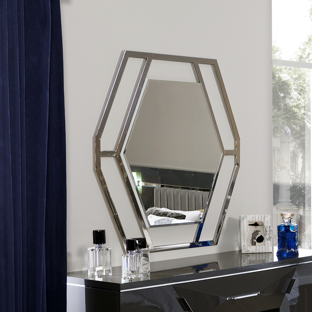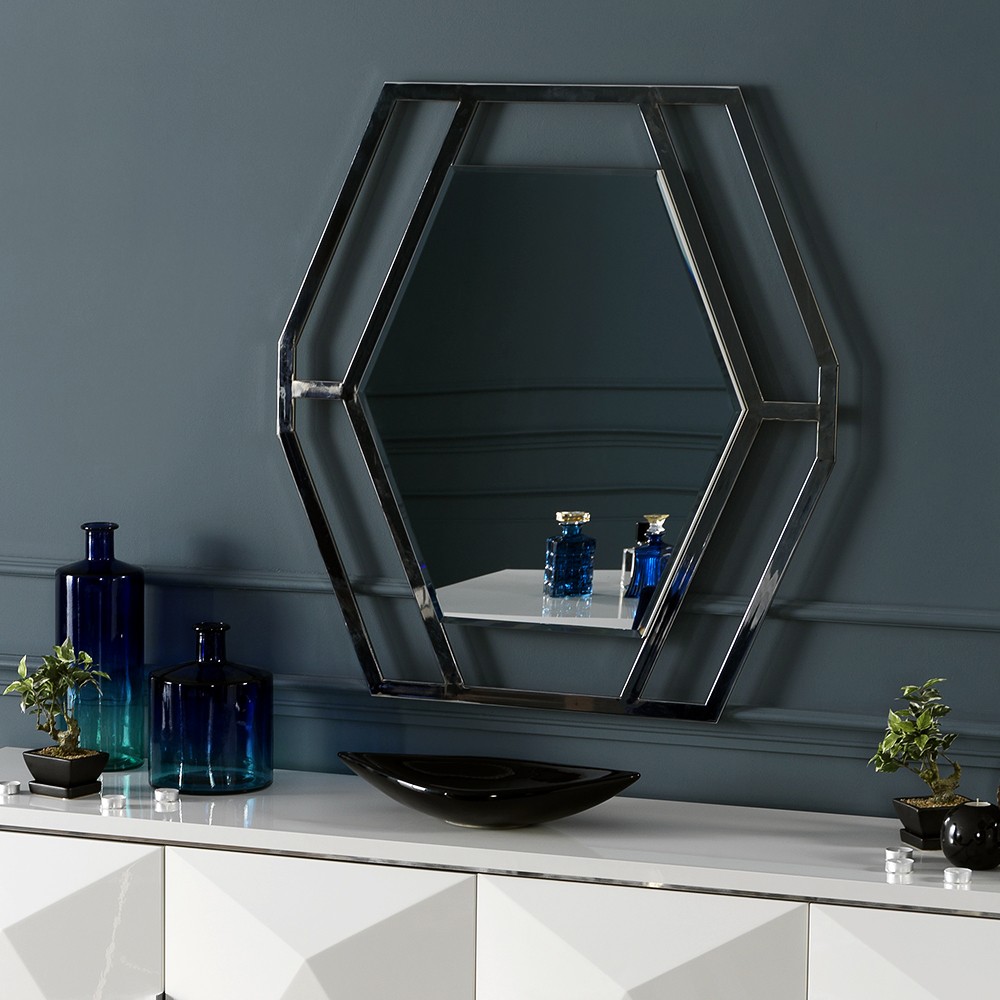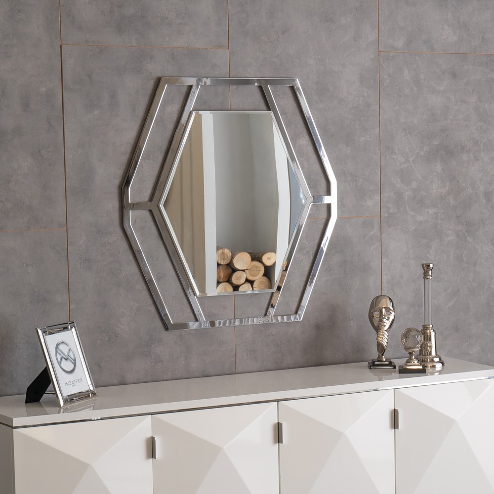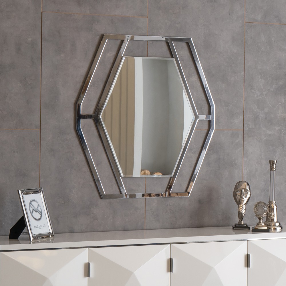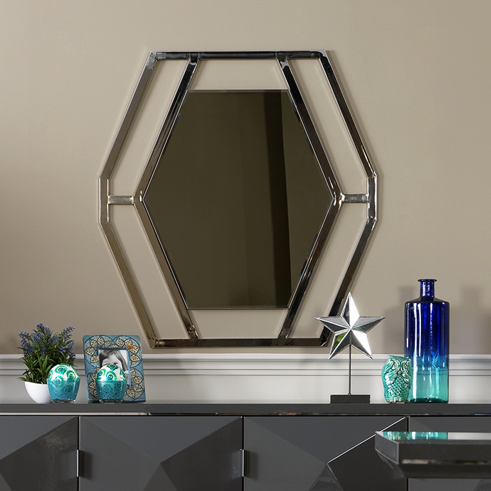 Specchio da parete dalla forma geometrica esagonale in metallo cromato, perfetto per arredare con eleganza soggiorno e camere. Facile da ...