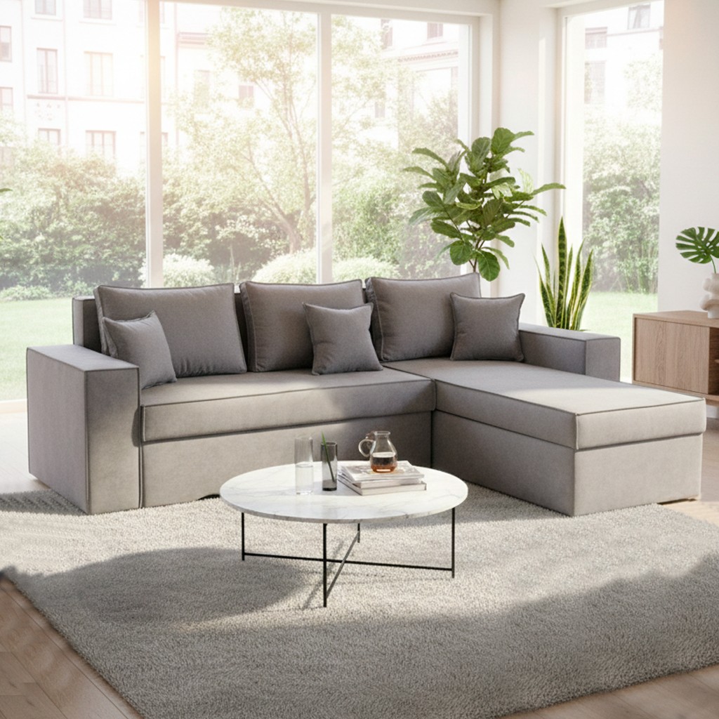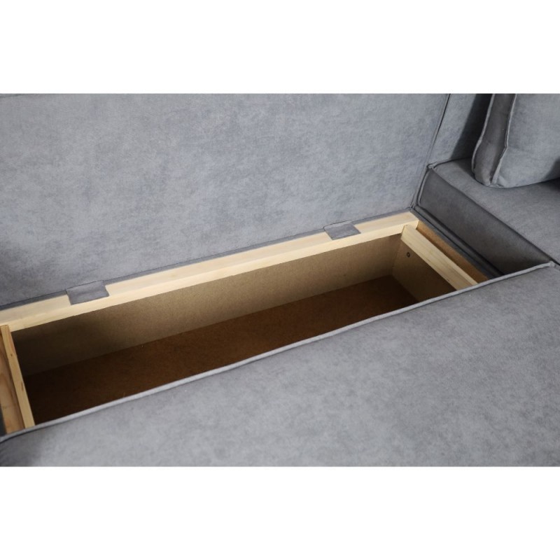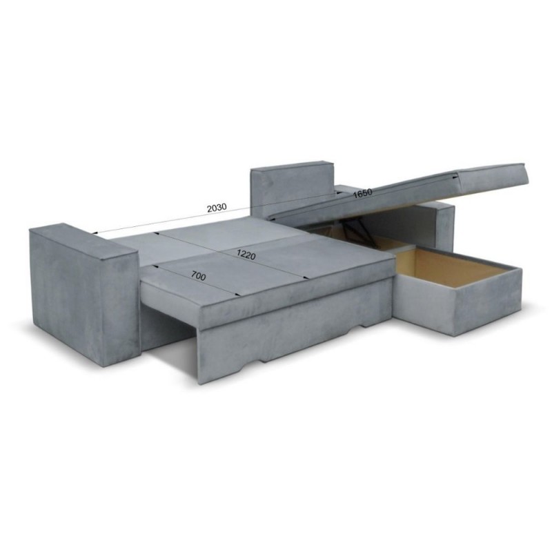 Divano angolare grigio con penisola contenitore e letto estraibile, perfetto per ambienti moderni che cercano praticità e comfort in un u...