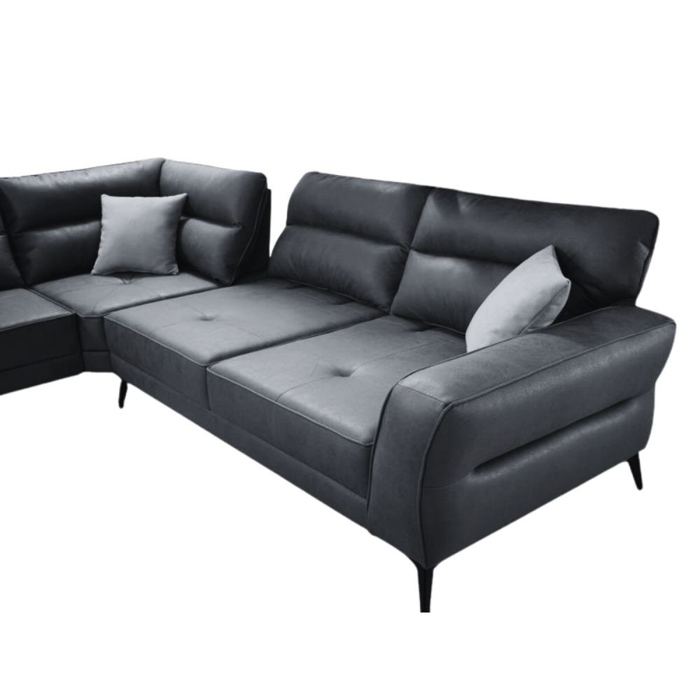 Divano angolare beige trasformabile in letto con meccanismo di spinta, rivestimento morbido e gambe metalliche nere per living moderni.