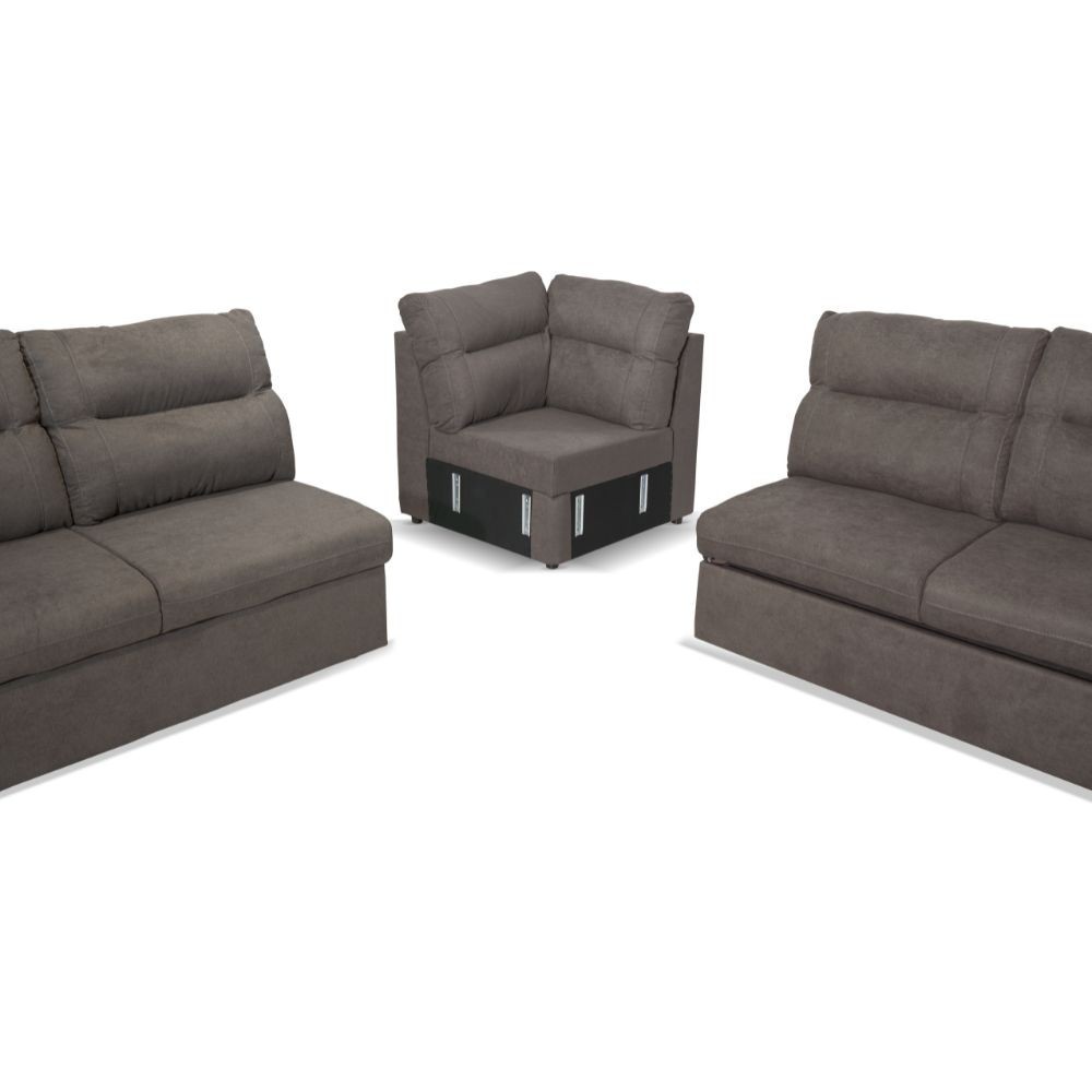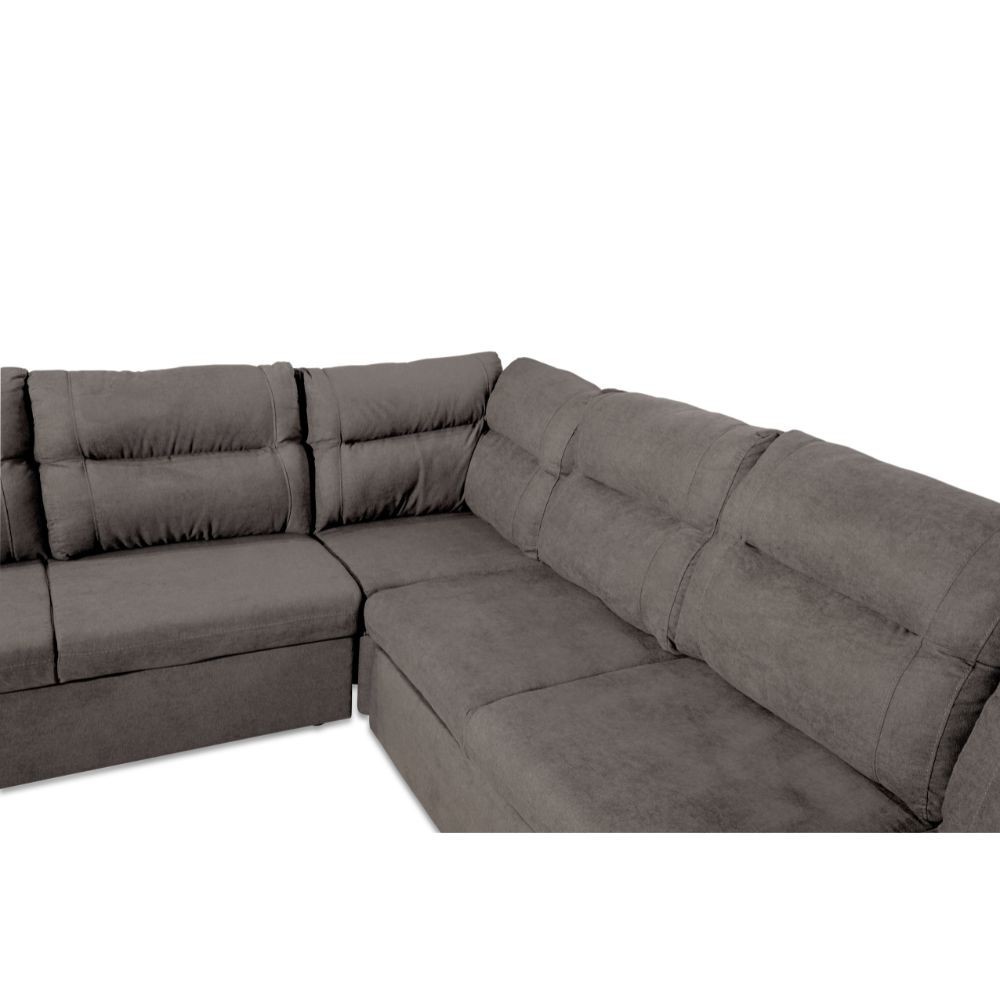 Divano angolare modulare in tessuto khaki con letto estraibile e spazi contenitori per riporre tutto quello che serve in casa.