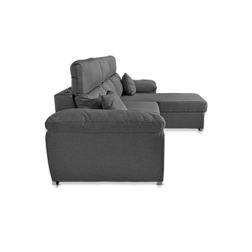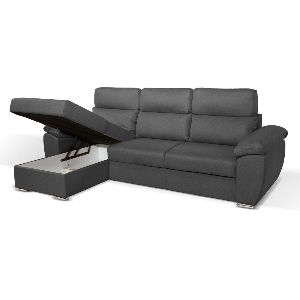 Divano grigio con penisola contenitore e letto estraibile, perfetto per living moderni dove servono spazi versatili e funzionali.