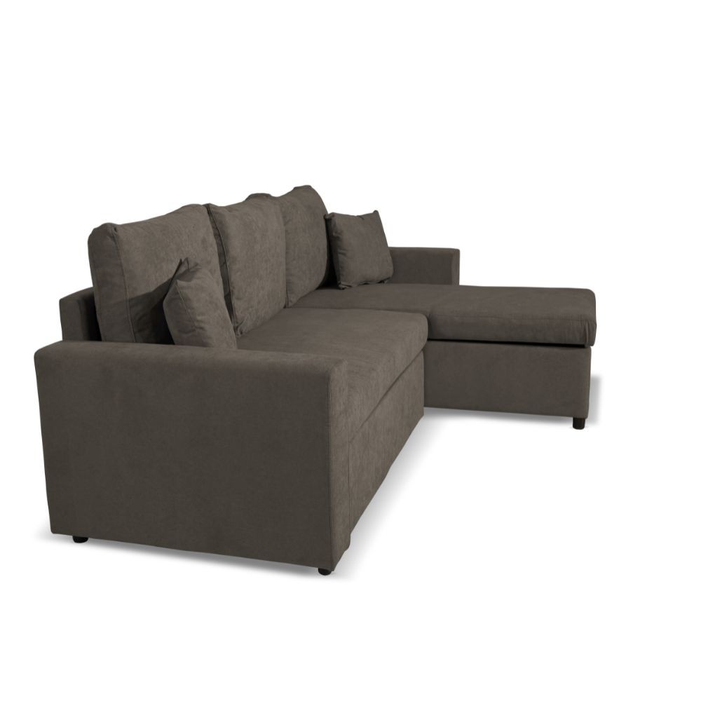 Divano con penisola reversibile e letto incorporato in tessuto khaki resistente. Perfetto per chi ha poco spazio e vuole comfort versatil...