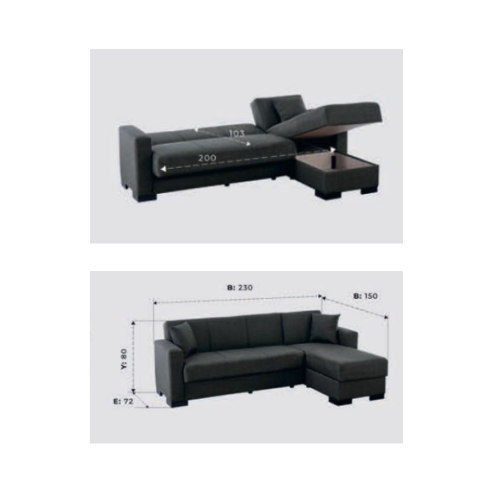 Divano letto con penisola contenitore reversibile, tessuto morbido tortora. Perfetto per chi ha poco spazio e cerca funzionalità.