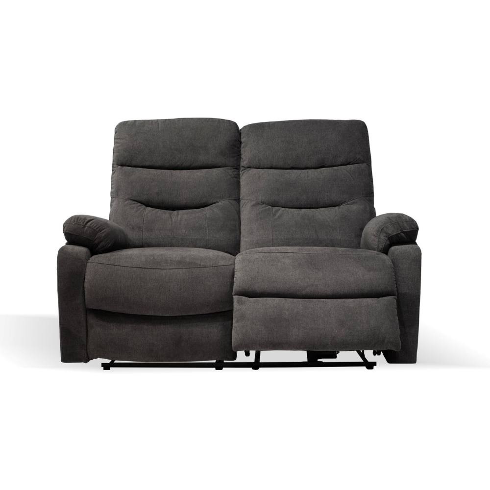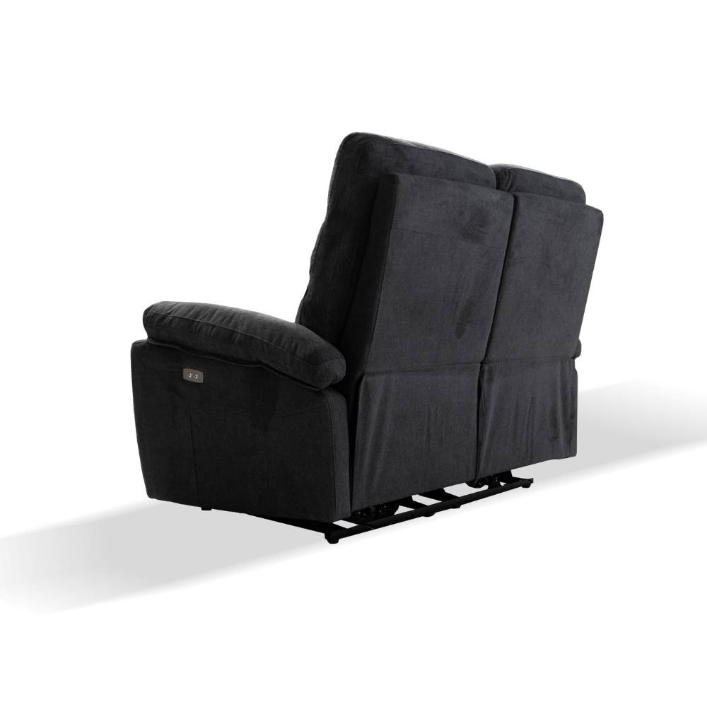 Divano grigio reclinabile 2 posti con schienale alto e 2 recliner elettrici, perfetto per il relax in soggiorno.