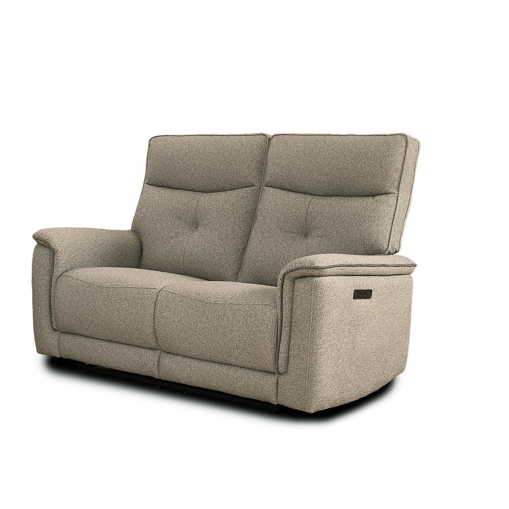 Divano reclinabile a due posti con movimento elettrico, rivestito in tessuto sabbia. Perfetto per rilassarsi in totale comodità con schie...