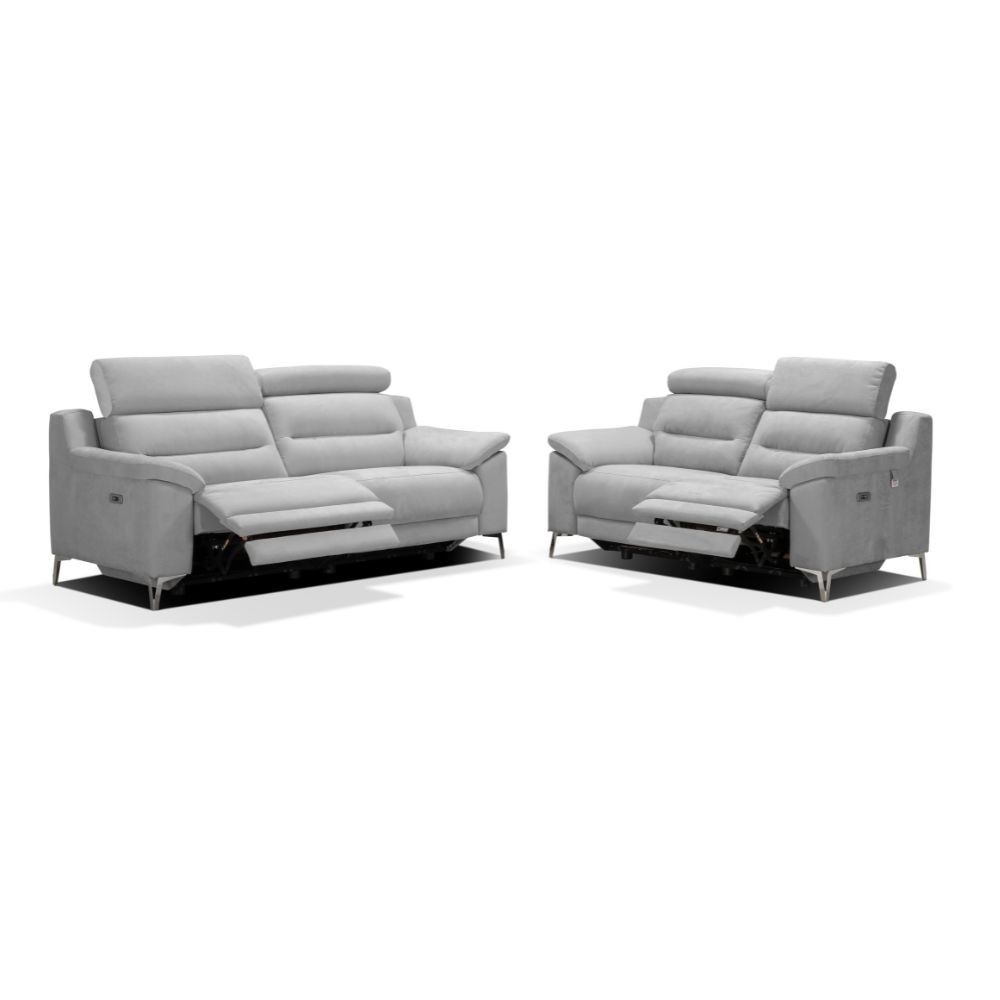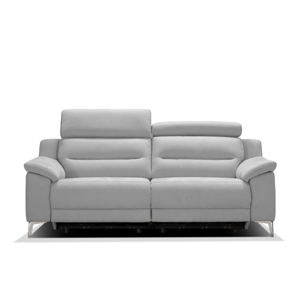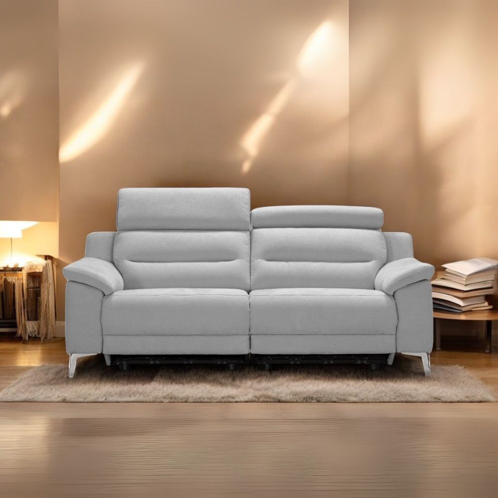 Divano grigio 3 posti con due sedute reclinabili elettriche e poggiatesta regolabile. Comfort totale per il relax in famiglia.