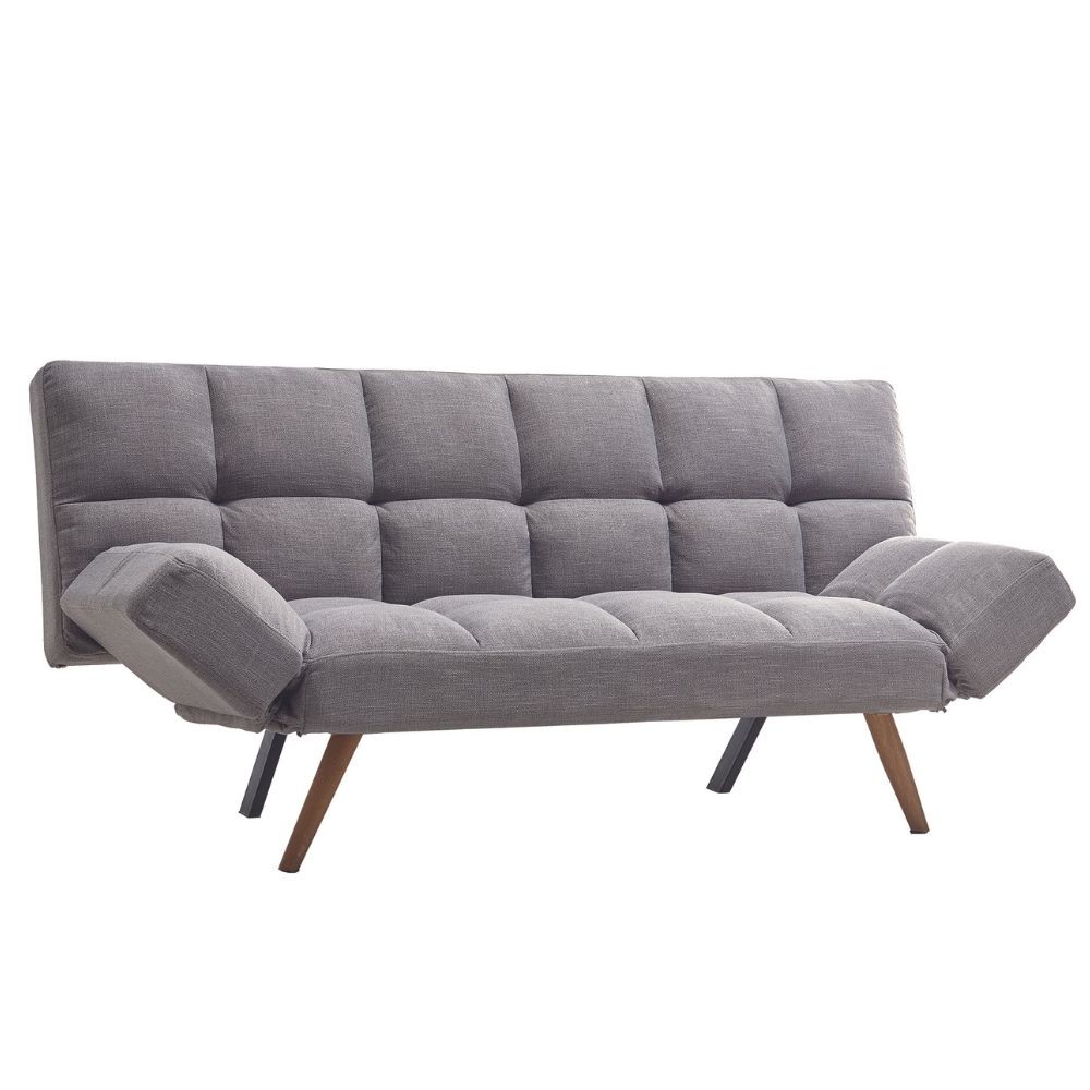 Divano letto grigio con braccioli pieghevoli, perfetto per trasformare il tuo salotto in camera ospiti in pochi secondi.