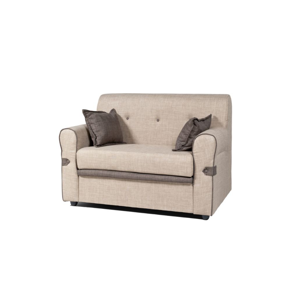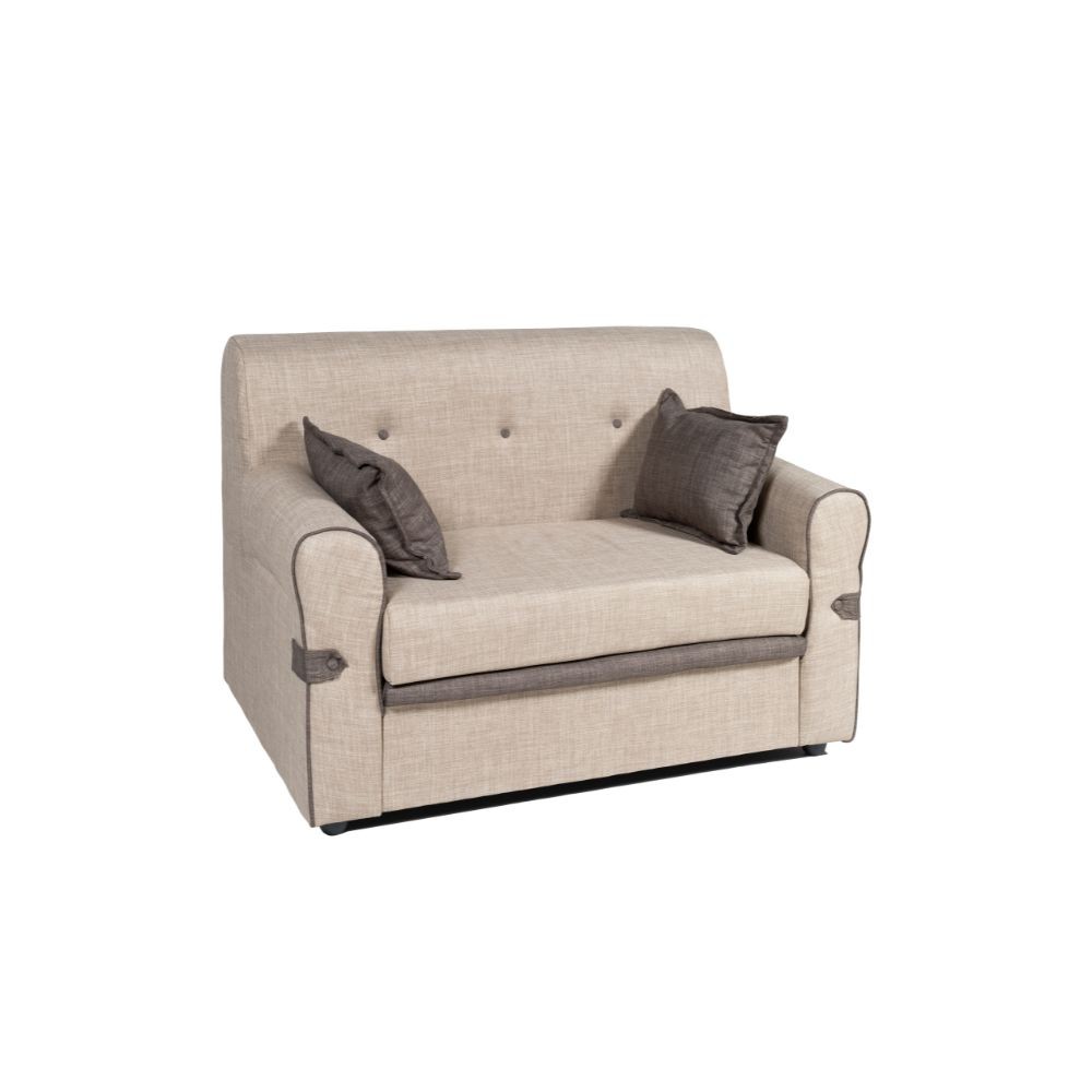 Divano due posti in tessuto morbido cappuccino con cuscini inclusi, perfetto per salotti moderni e accoglienti.