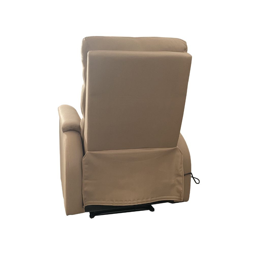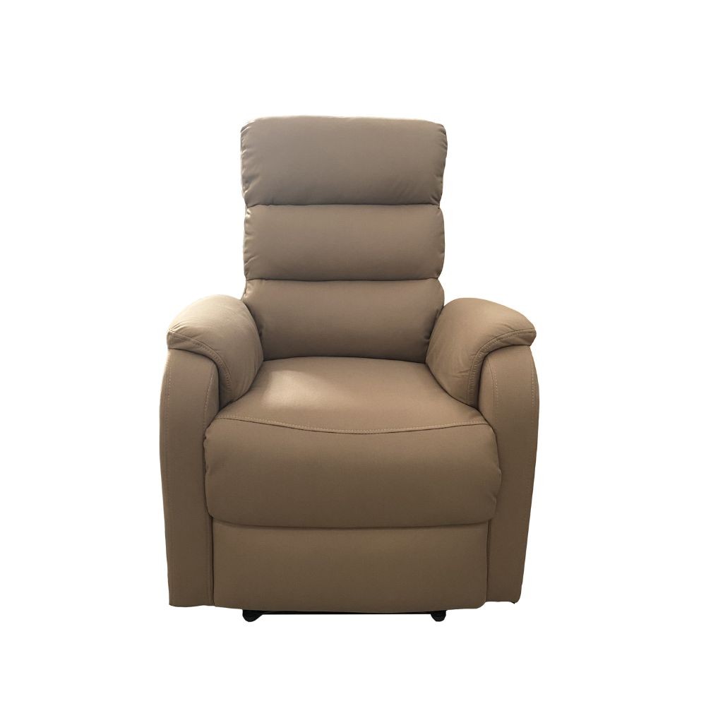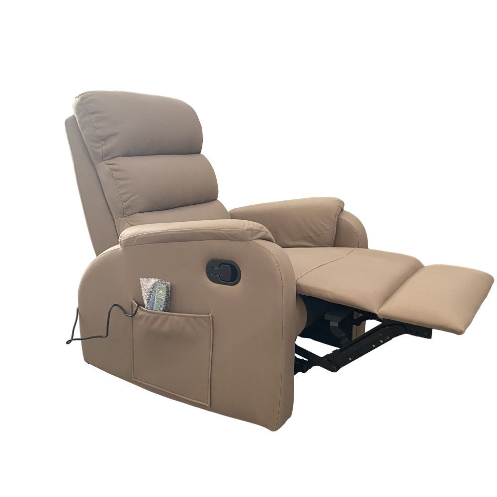 Poltrona relax in tessuto taupè con 8 massaggi e leva manuale. Comfort totale per il tuo riposo a casa.
