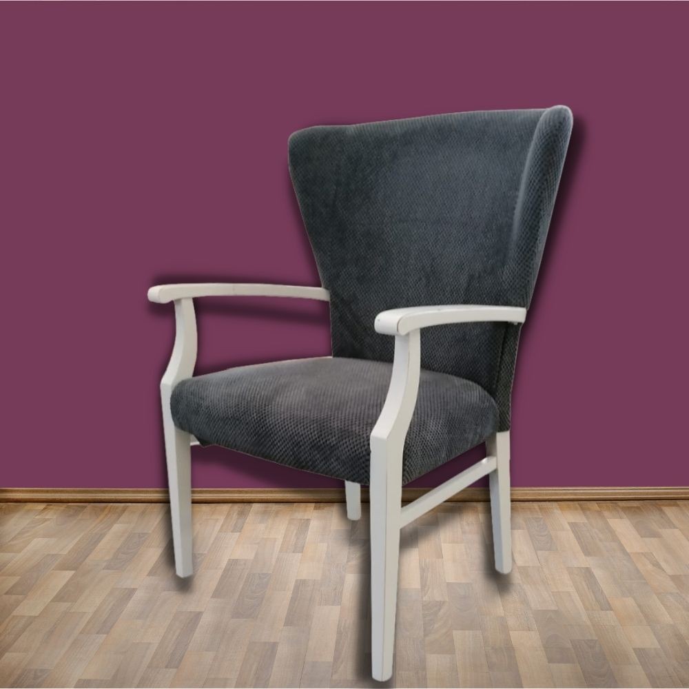 La struttura in bianco consumato, seduta e schienale in tessuto grigio, la rendono facile da abbinare ad ogni ambiente come soggiorno o camera da letto.