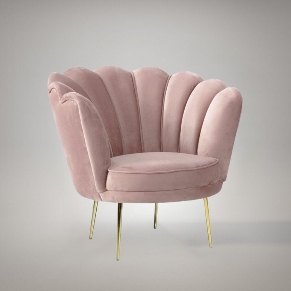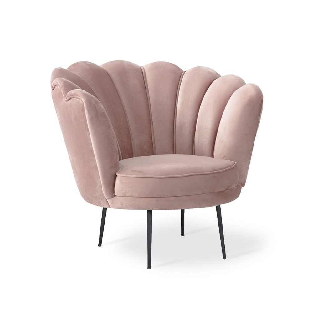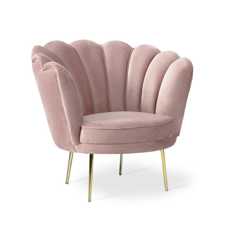 Poltrona in tessuto rosa con forma ergonomica e piedi metallo. Morbida e accogliente per il tuo relax quotidiano in salotto.