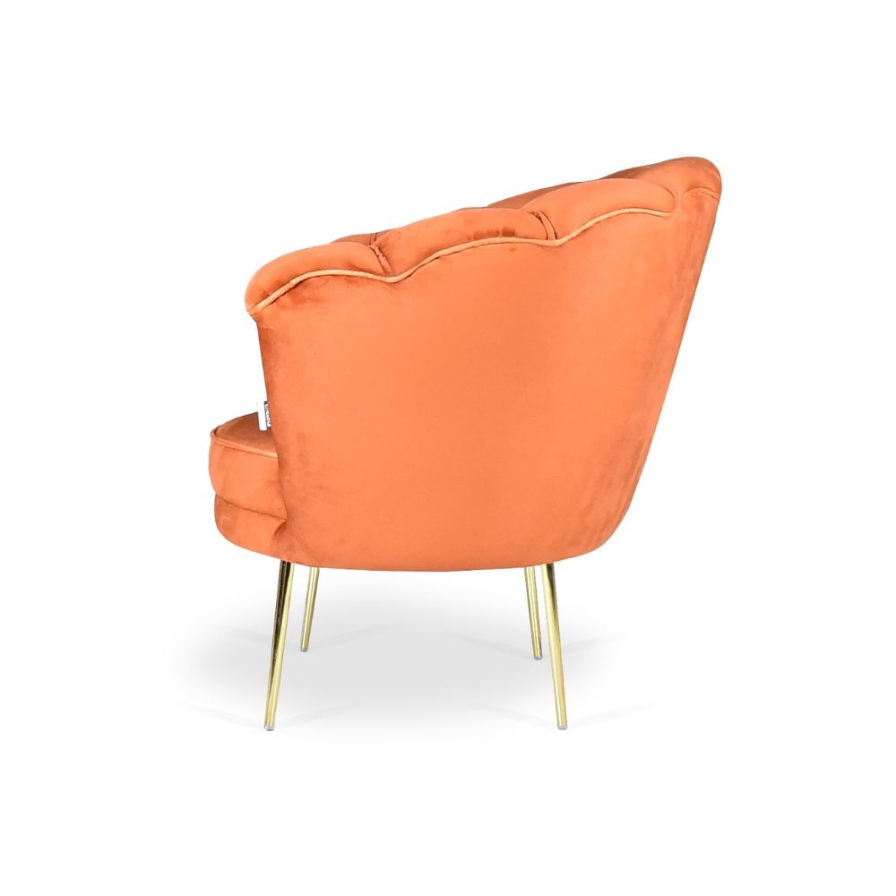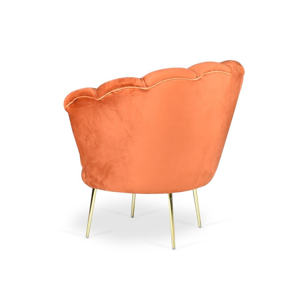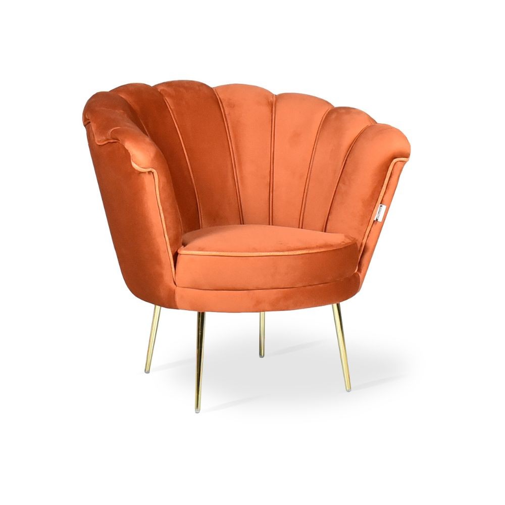 Poltrona conchiglia in morbido velluto ruggine con piedini dorati. Comfort avvolgente e design elegante per il tuo salotto moderno.