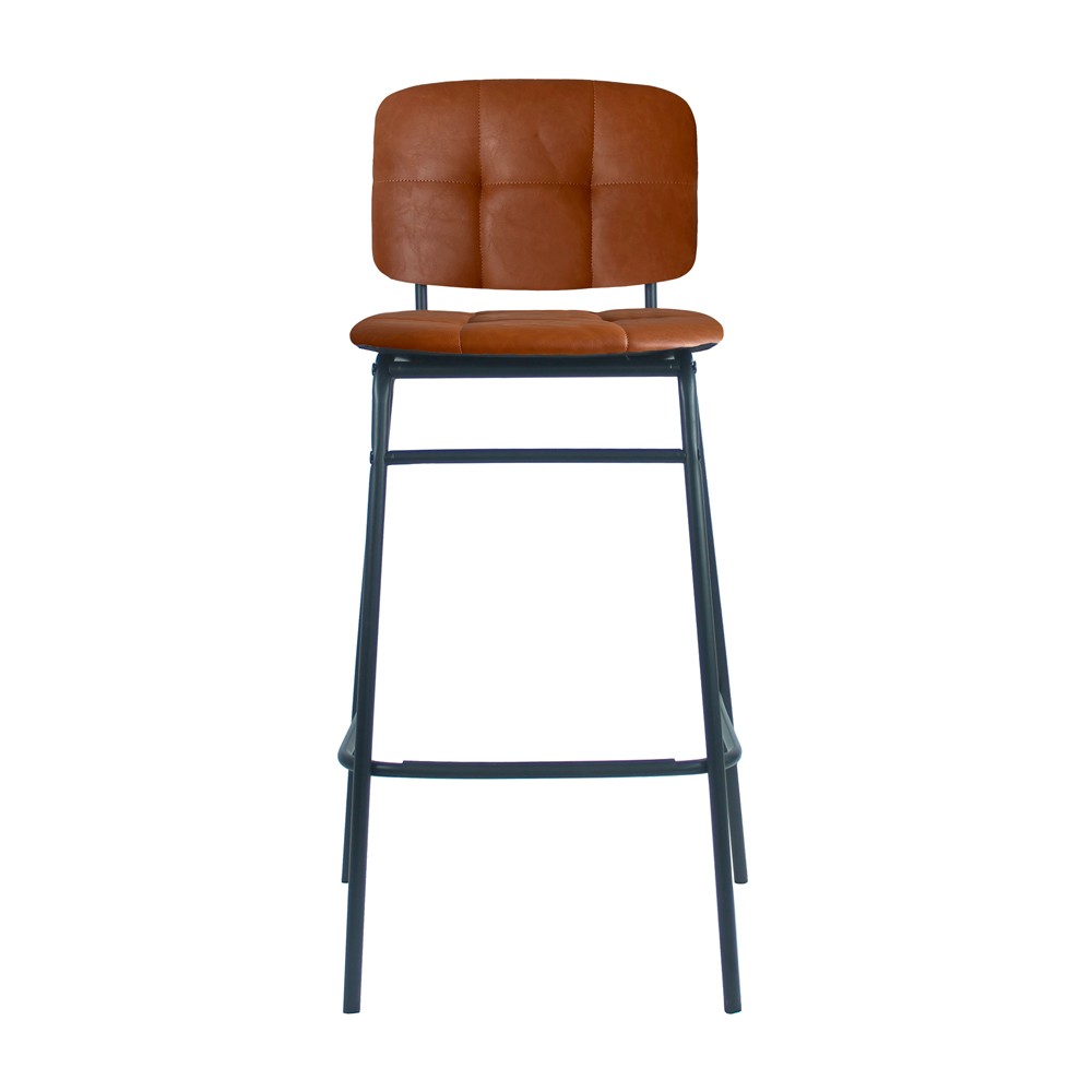 Sgabello con seduta in ecopelle mattone e gambe nere, perfetto per la cucina o il bar. Comodo e resistente.