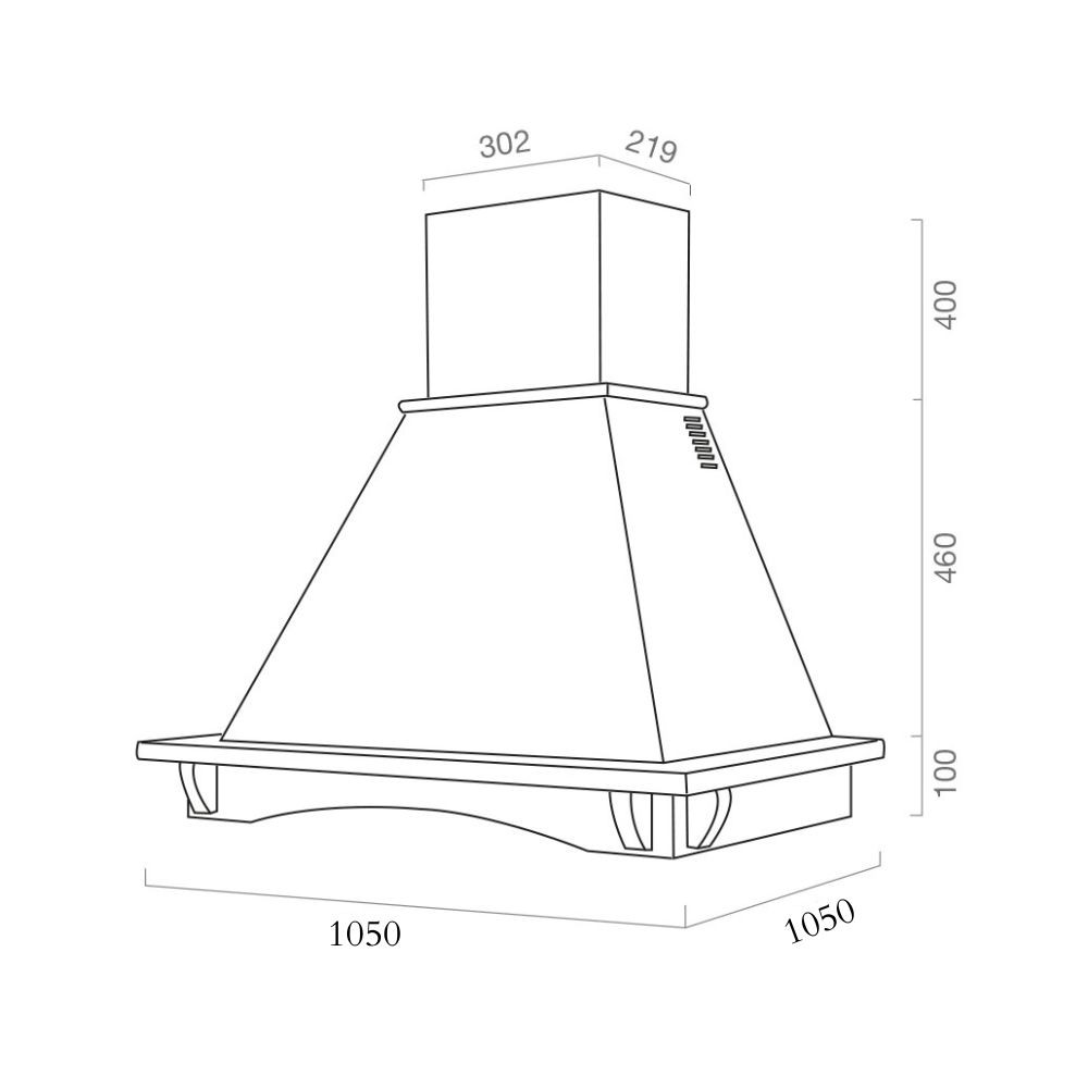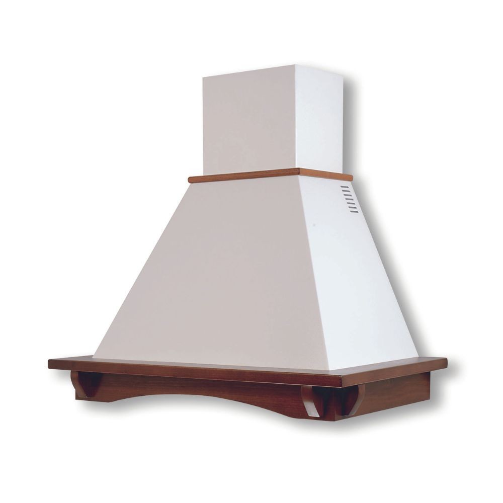 Cappa angolare in legno massello e finitura panna, perfetta per cucine rustiche. Aspirante con comandi semplici e luce LED integrata.